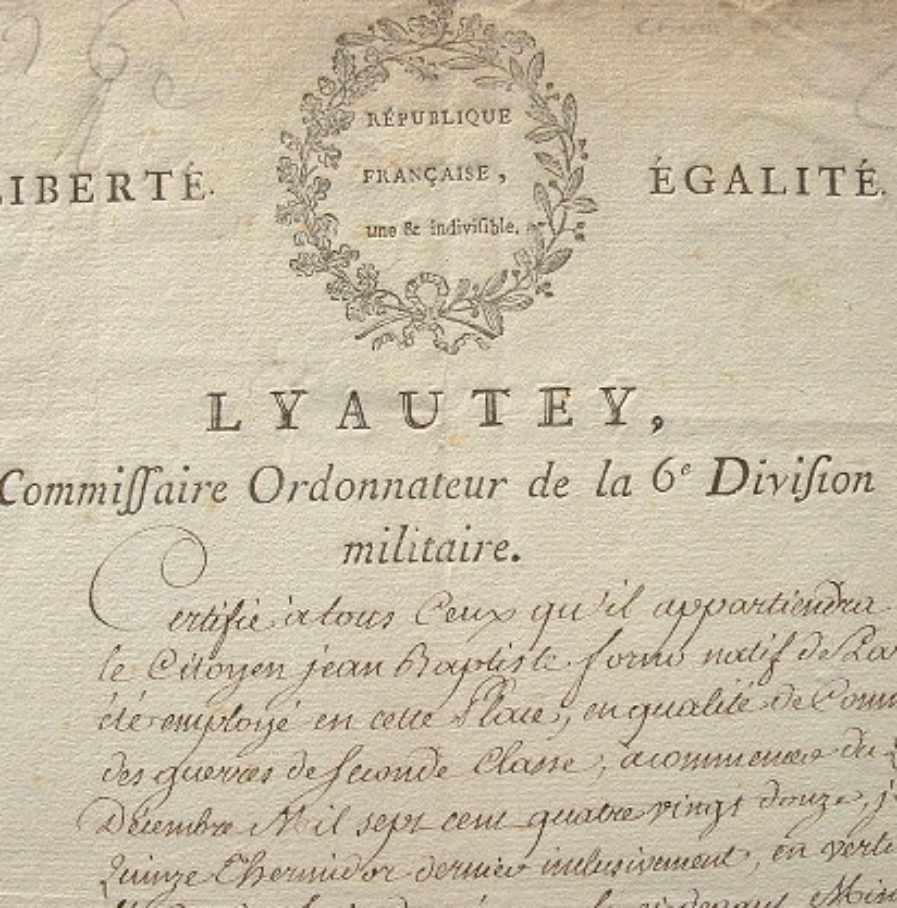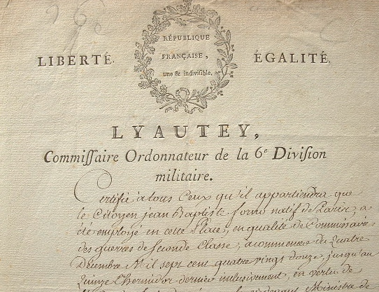 Certificat délivré par Pierre Antoine Lyautey pour Jean-Baptiste Forno qui «a été employé en cette place, en qualité de commissaire des guerres de seconde classe [...]».