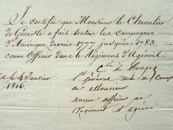Certificat apostillé et signé par le comte de Bruges, qui participa à la guerre d'Indépendance américaine, comme cadet-gentilhomme puis sous-lieutenant du régiment d'Agenais. «Je certifie que monsieur le Chevalier de Gineste a fait toutes les campagnes d'Amérique depuis 1777 jusqu'en 1783 comme officier dans le régiment d'Agenois». [Le chevalier Etienne de Gineste-Najac (né en 1759), fit toute la guerre d'Indépendance comme lieutenant dans le régiment d'Agenais ; il se distingua particulièrement à la prise de Saint-Christophe où deux compagnies de son régiment forcèrent 1500 Anglais à se rembarquer].