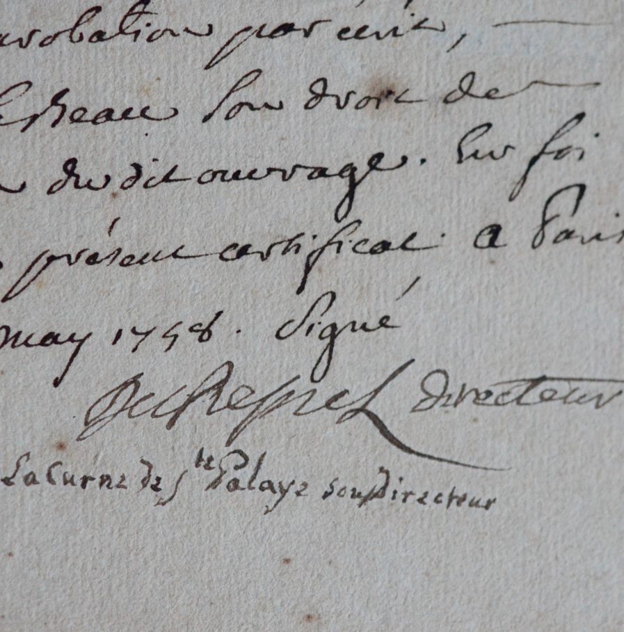 Certificat contresigné par Jean-Baptiste de La Curne de Sainte-Palaye, peu avant sa réception à l'académie française (au siège de M. de Boissy, le Lundi 26 Juin 1758). Il était également membre de l'Académie des inscriptions et belles-lettres.