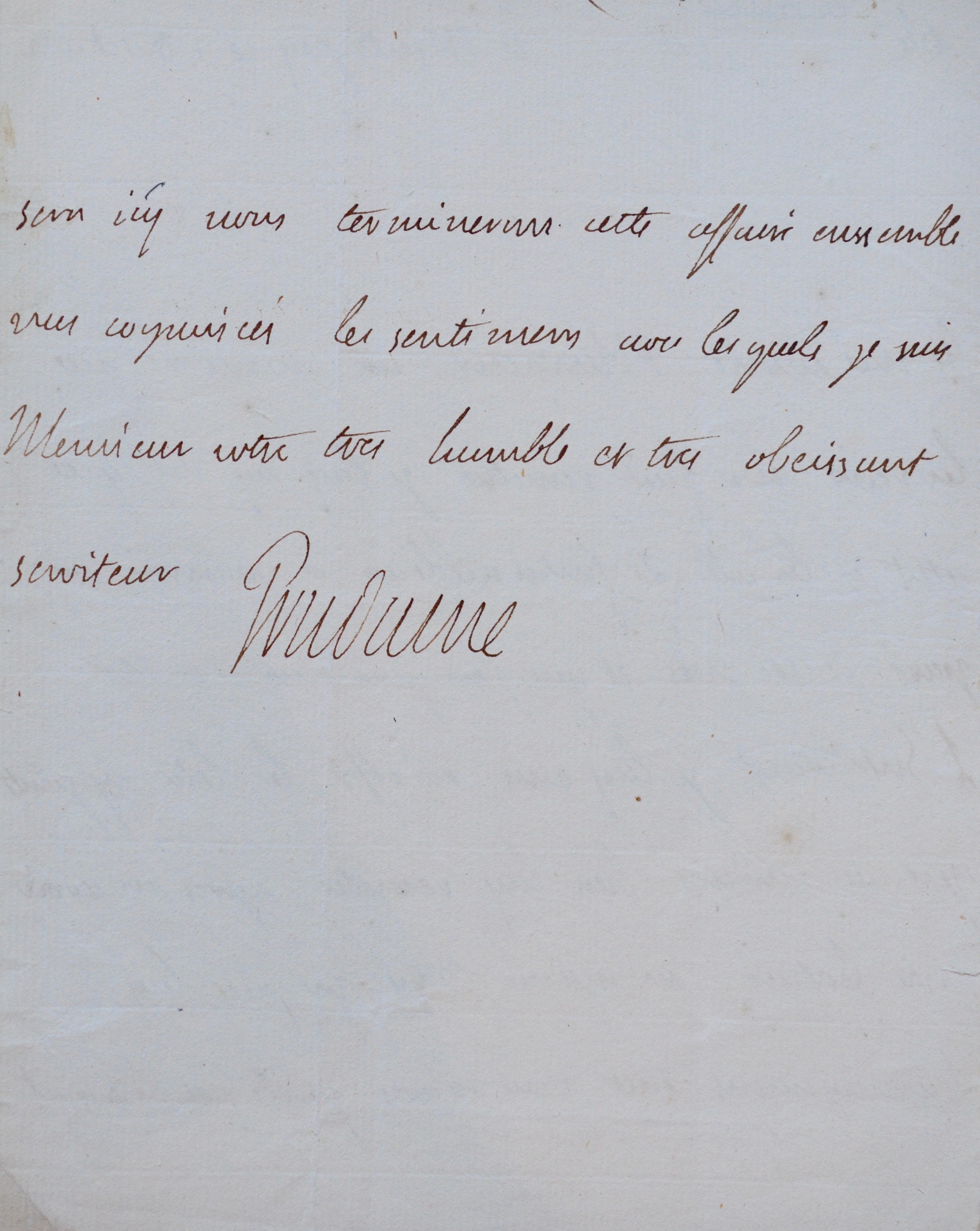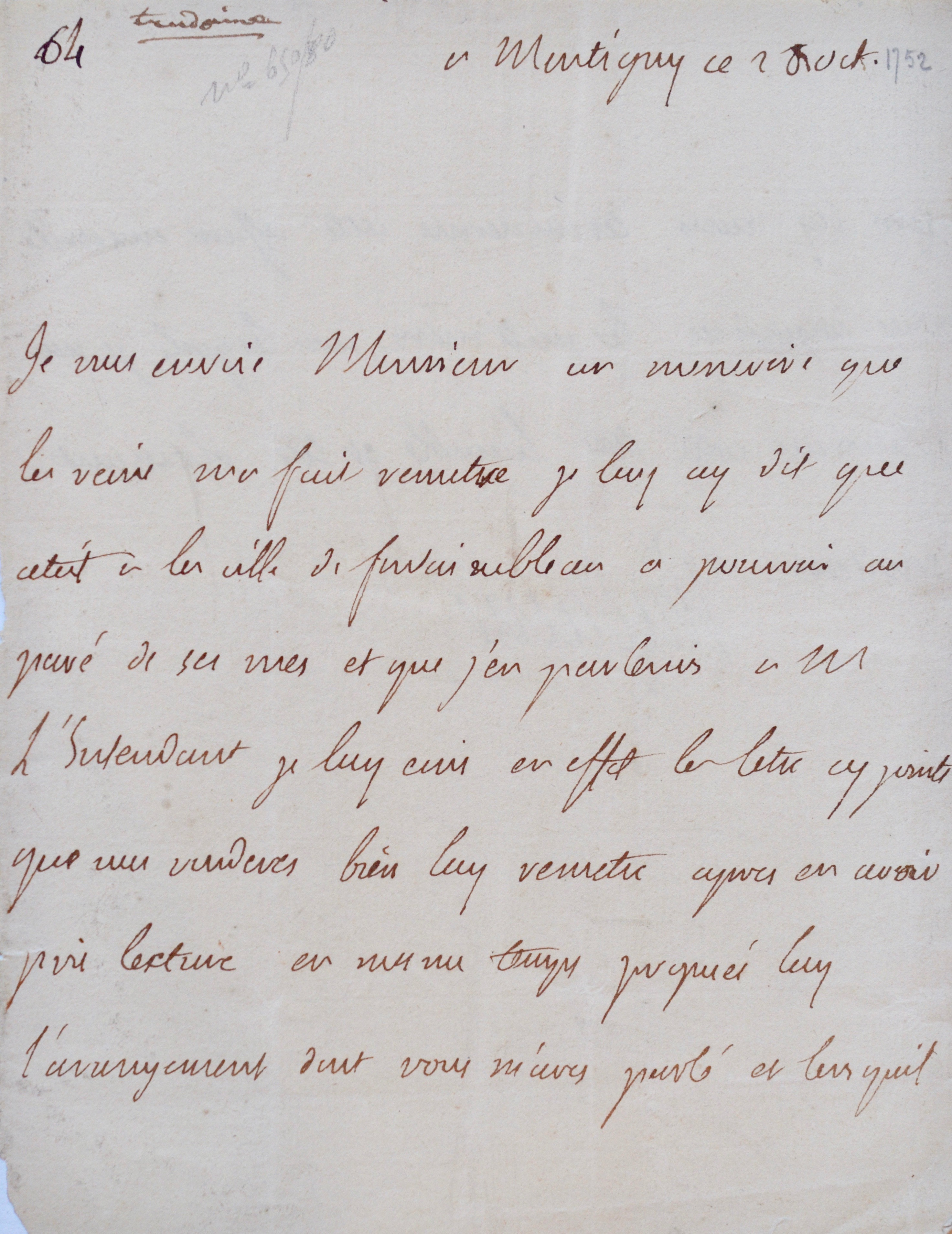 Lettre de Trudaine, directeur des Ponts et Chaussées. "Je vous envoie, Monsieur, un mémoire que la reine m'a fait remettre. Je luy ay dit que c'était à la ville de Fontainebleau de pourvoir au pavé de ses rues et que j'en parlerai à M. l'Intendant [...]".