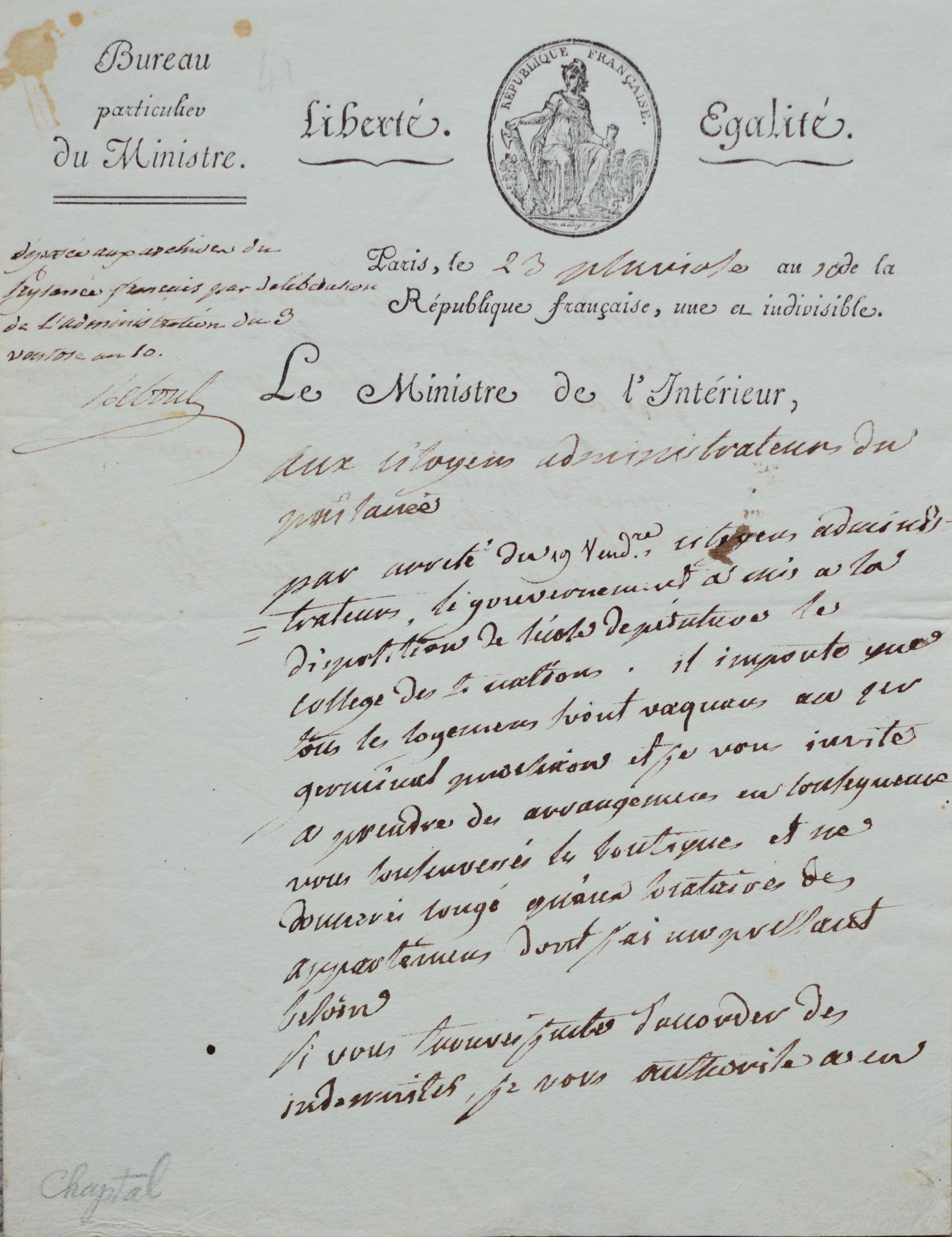 "Par arrêté du 19 Vendre, citoyens administrateurs, le gouvernement a mis à la disposition de l'école de pritanée le Collège des 4 nations. Il importe que tous les logemens soient vaquans au 2em germinal prochain et je vous invite a prendre des arrangemens en conséquence vous bouleversés les boutiques et ne donnerai congé qu'aux locataires des appartemens dont j'ai un pressant besoin.