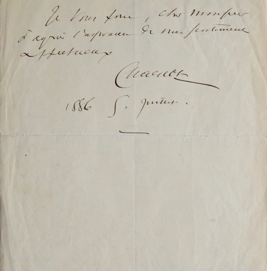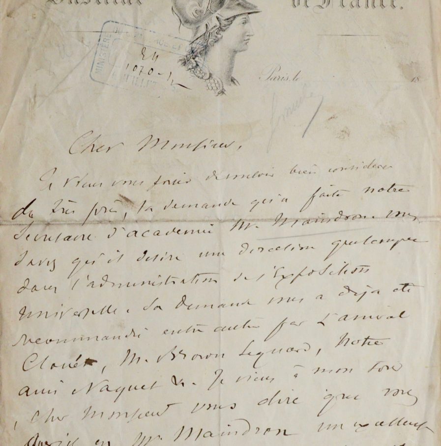 Jean-Martin Charcot demande à son correspondant de bien vouloir considérer "de très près" une demande faite par Ernest Maindron, secrétaire de l'Académie des sciences. Ce dernier voudrait "une direction quelconque dans l'administration de l'Exposition universelle". Cette demande a déjà été appuyée par Brown-Séquard, Alfred Naquet et l'amiral Georges Cloué, etc. Charcot loue les qualités d'administrateur et d'archiviste de Maindron.