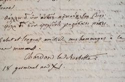 Simon Chardon de La Rochette (La Rochette, près de Mende., 1755/1814)Chardon de La Rochette se relève d'ennuis de santé qui l'ont obligé à différer son voyage dans le Piémont, qu'il compte prolonger pour rattraper le temps perdu. Mais ce qui l'inquiète, c'est sa situation financière, et celle de ses créanciers qui le mettent dans l'obligation d'emprunter 1200 francs pour pouvoir partir ; il demande à son ami d'être sa caution. «J'aime assez ce passage de Saint-Luc (ch X. v85, 30-5) ou plutôt cette allégorie que l'on met dans la bouche de Jésus. Un homme descendait de Jérusalem à Jéricho, dépouillé par des voleurs et meurtri de coups, il était étendu sur le grand chemin, à demi mort. Il passe un prêtre ; mais ce prêtre passe outre ; il survient un lévite et ce lévite passe aussi son chemin ; mais enfin arrive un Samaritain, comme qui dirait un calviniste ou un luthérien, il bande ses plaies, il les bassine avec de l'huile et du vin ; il le met sur son cheval ; il le conduit chez lui et il ordonne à son concierge, après lui avoir laissé quelque argent, d'en avoir soin, parce qu'il lui tiendrait compte du surplus. Vous serez, j'espère, ce Samaritain [...]».