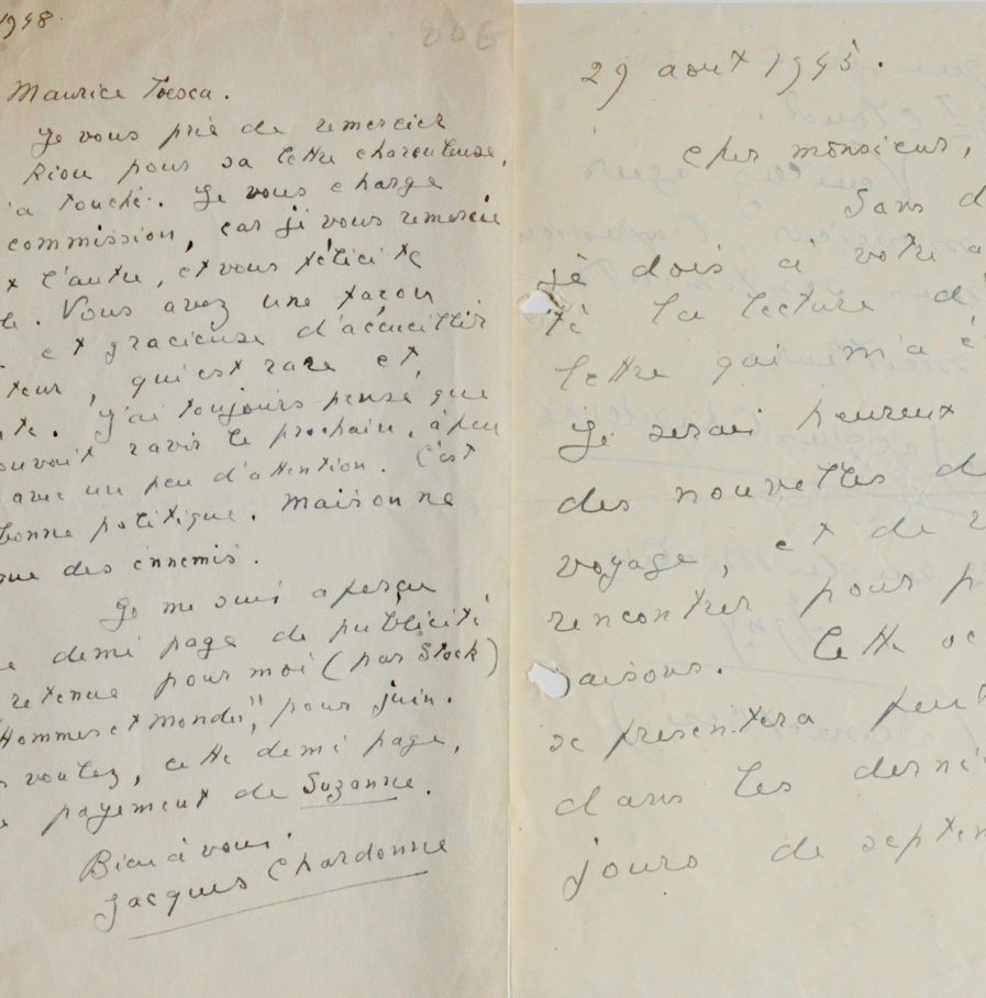 Deux lettres de Jacques Chardonne à Maurice Toesca