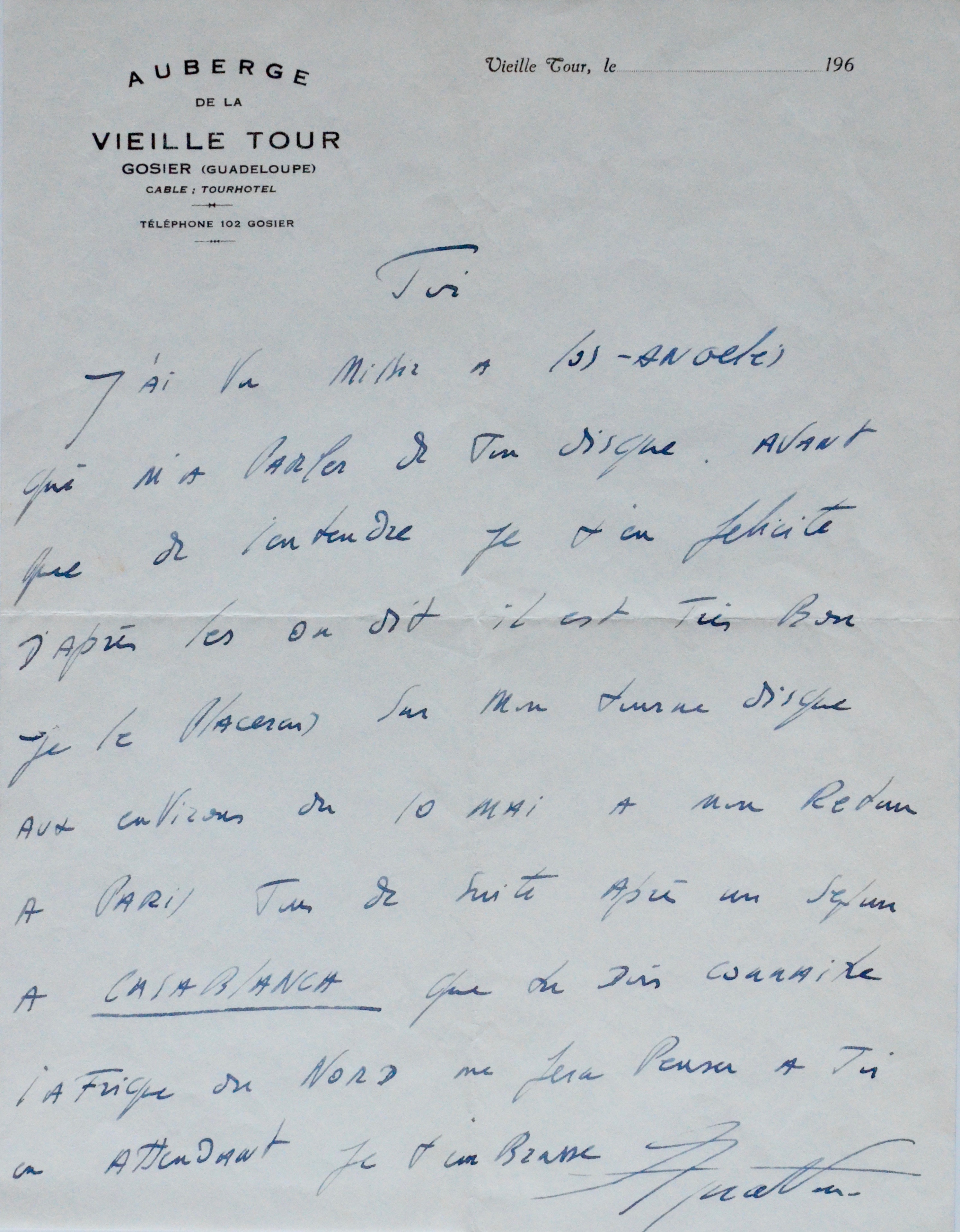 Charles Aznavour (1924/2018)Lettre de Charles Aznavour, écrite de Guadeloupe, à la chanteuse Solange Surveille dite Camille.