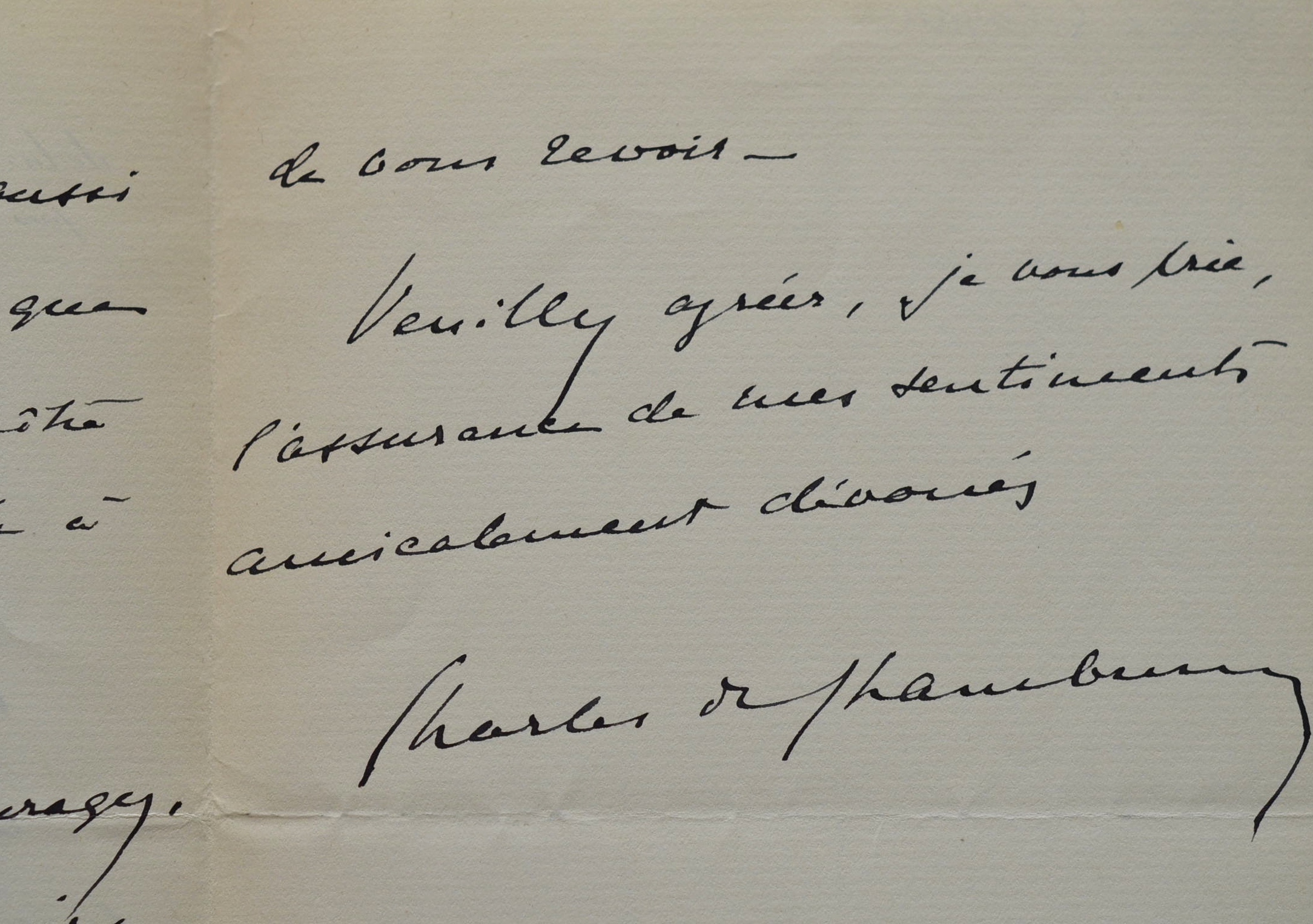 Charles Chambrun (de) (Washington, 1875/1952)Cette lettre de Charles de Chambrun est relative à son départ d'Italie. Charles de Chambrun quitte son poste d'ambassadeur qu'il occupait depuis 1933 au Palais Farnèse.