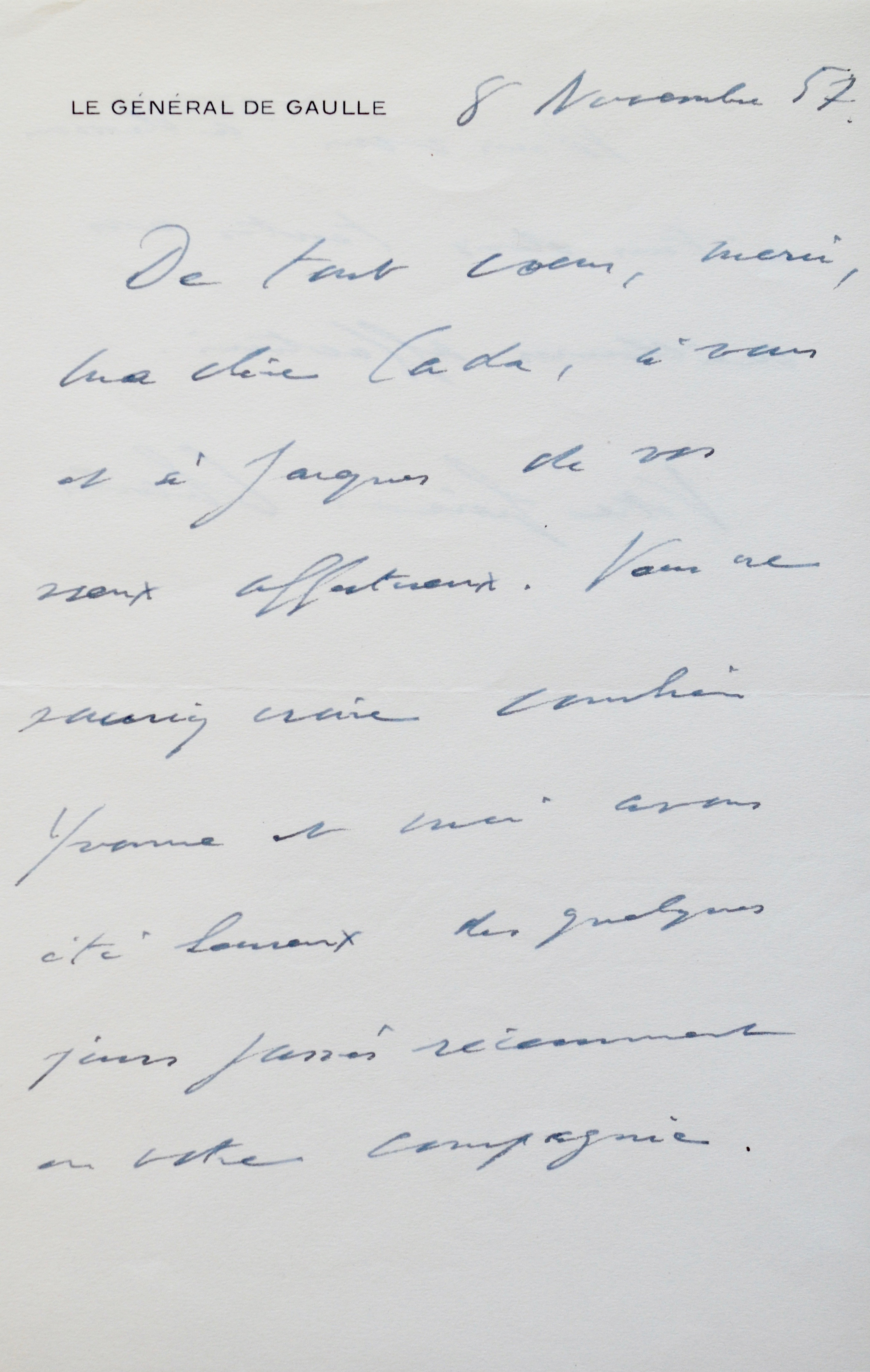 "De tout coeur, merci, ma chère Cada, à vous et à Jacques de vos voeux affectueux. Vous ne sauriez croire combien Yvonne et moi avons été heureux des quelques jours passés récemment en votre compagnie. Nous vous adressons à tous les deux toutes nos meilleures affections". Il signe : "Votre frère : Charles".