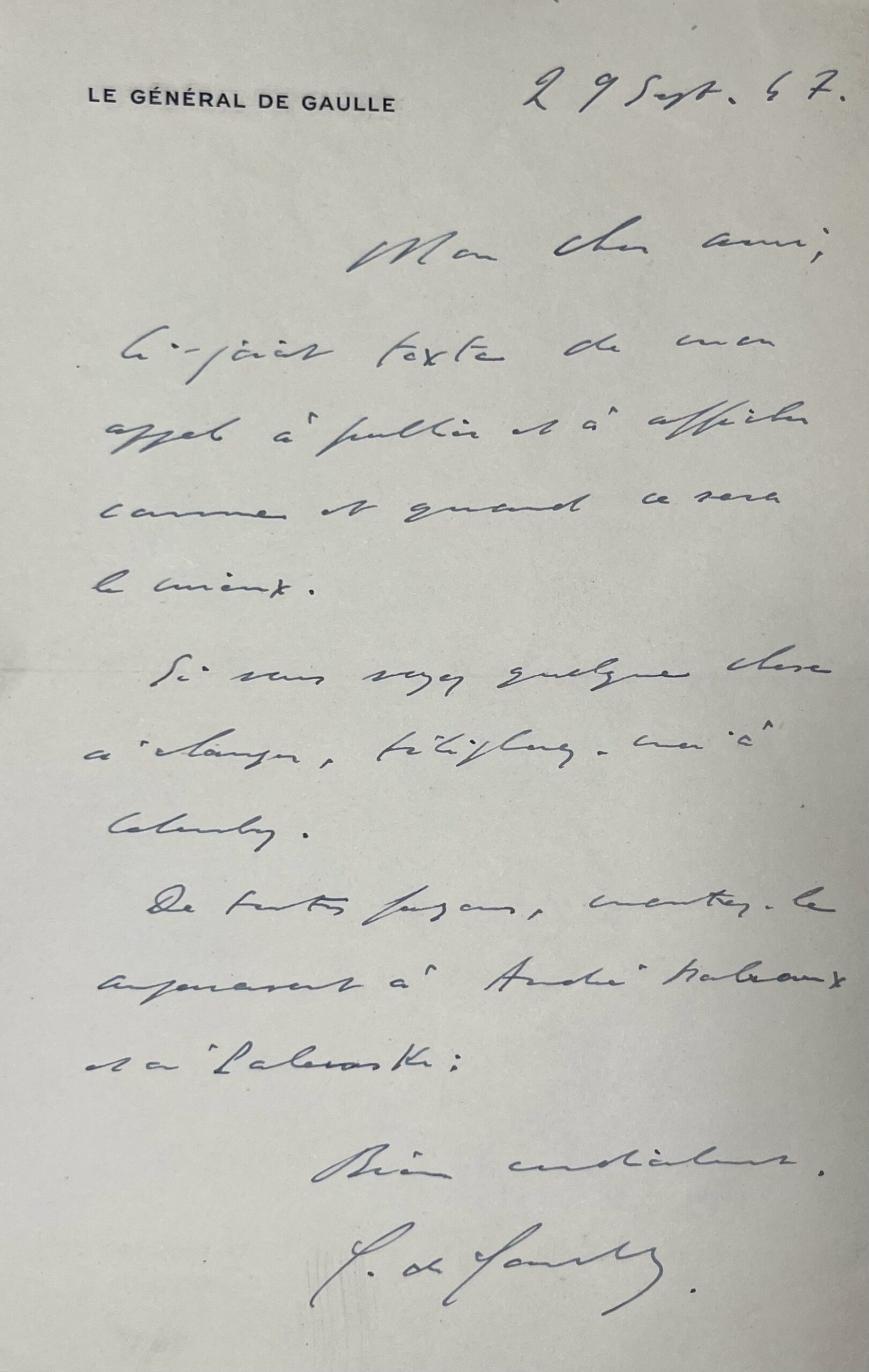 "Mon cher ami. Ci-joint texte de mon appel à publier et à afficher comme et quand ce sera le mieux. Si vous voyez quelque chose à changer, téléphonez-moi à Colombey. De toutes façons, montrez-le auparavant à André Malraux et à Palewski. Bien cordialement. C. de Gaulle".