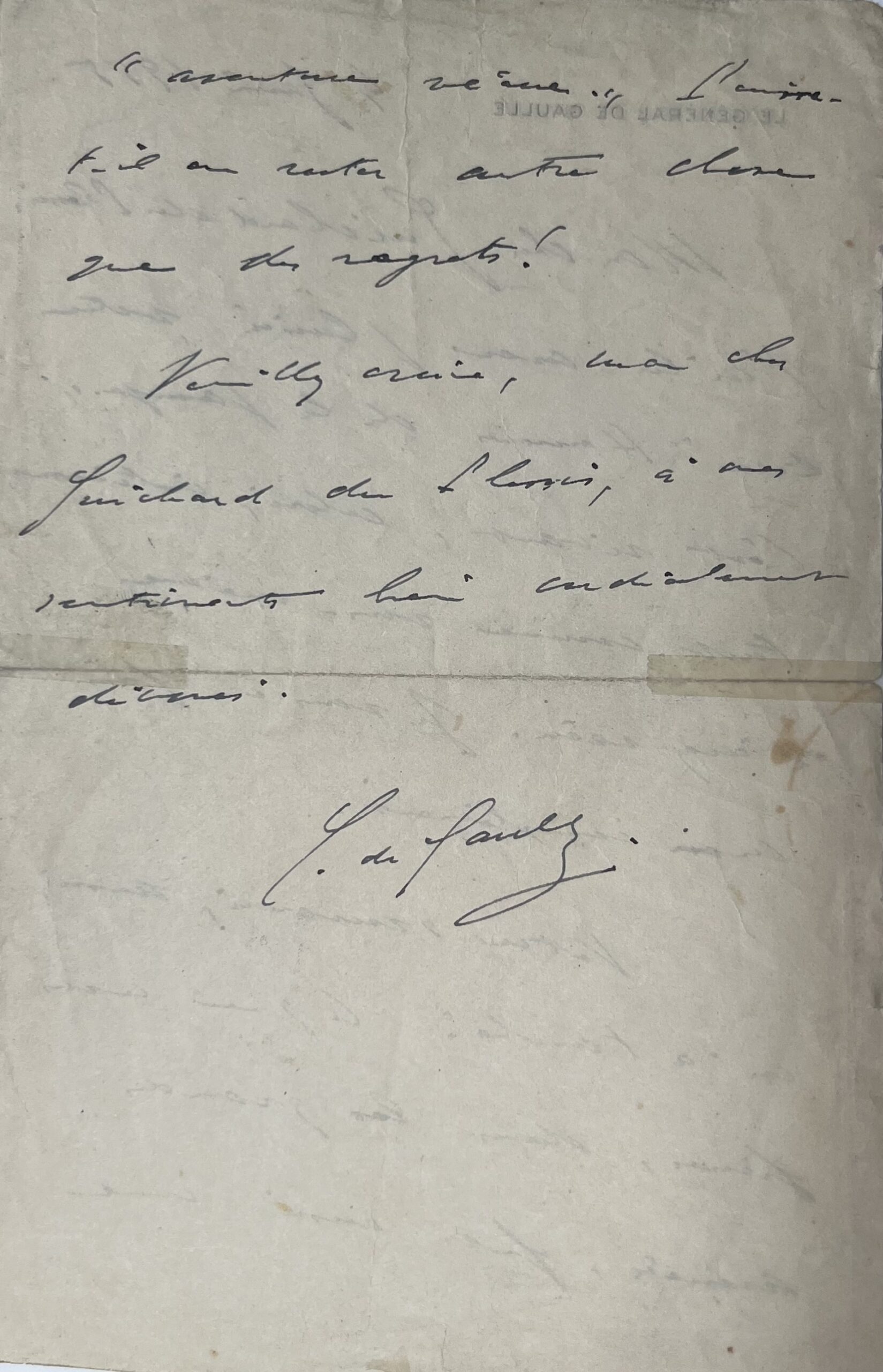 "J'ai lu avec plaisir votre livre "Hommes de la Pampa". C'est vivant, coloré, intéressant, tout comme vous-même l'avez vécu. Je vous en fais mon compliment. Votre souvenir, aussi, m'a touché ! Ce que nous fûmes, dans les grandes années, fut aussi une "aventure vécue". Puisse-t-il en rester autre chose que des regrets ! [...]".