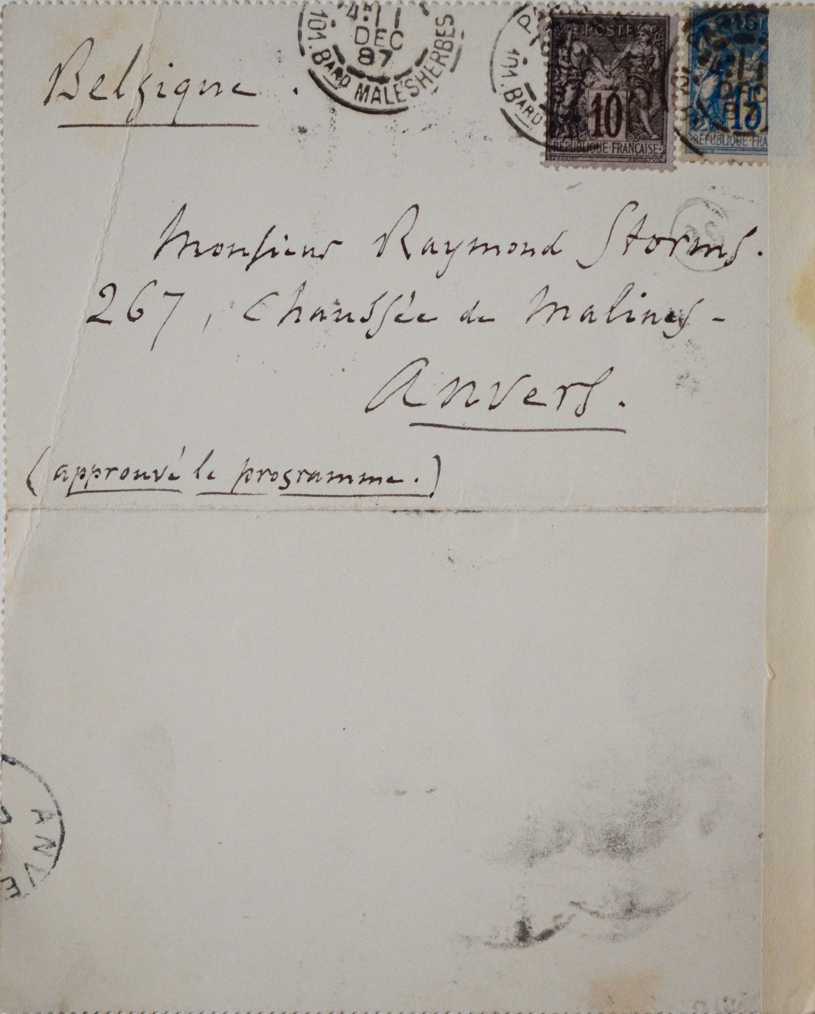 -5 octobre 1887 - Il envoie un projet de programme à Storms et l'invite a s'entendre avec les éditeurs Leduc, Choudens et Lemoine, et avec Mme Colombier, pour la location de la musique. Il cite "Fantaisie", "Concerto", "Symphonie en Ré", "L'Ouverture du Médecin", "L'Air de la Reine de Saba", "Mireille", "Marche funèbre d'une marionnette", "Vision de Jeanne d'Arc", etc.