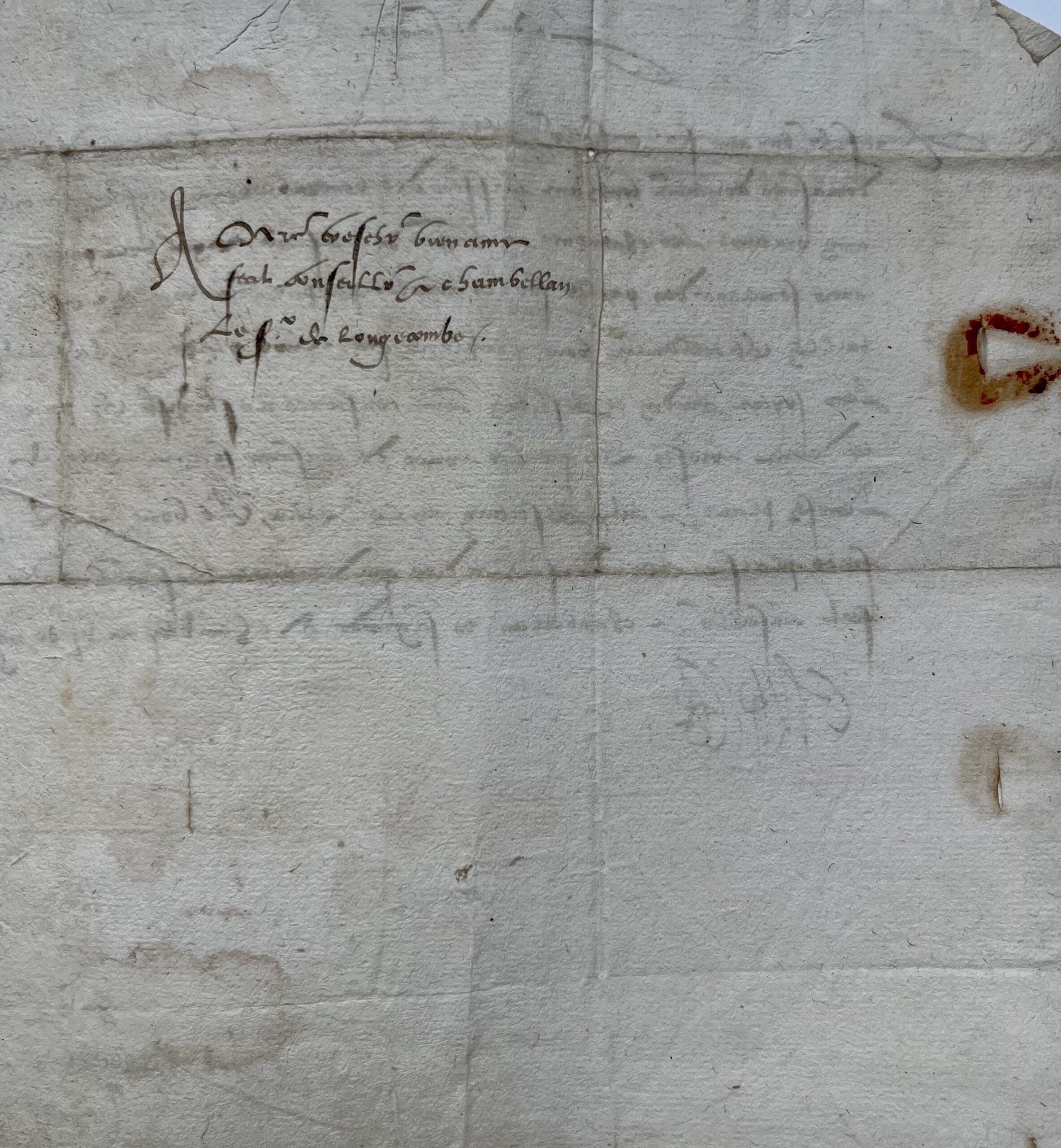 Au verso, adresse : "A nostre très cher bien aimé féal conseiller & chambellan me Str de Longecombe".