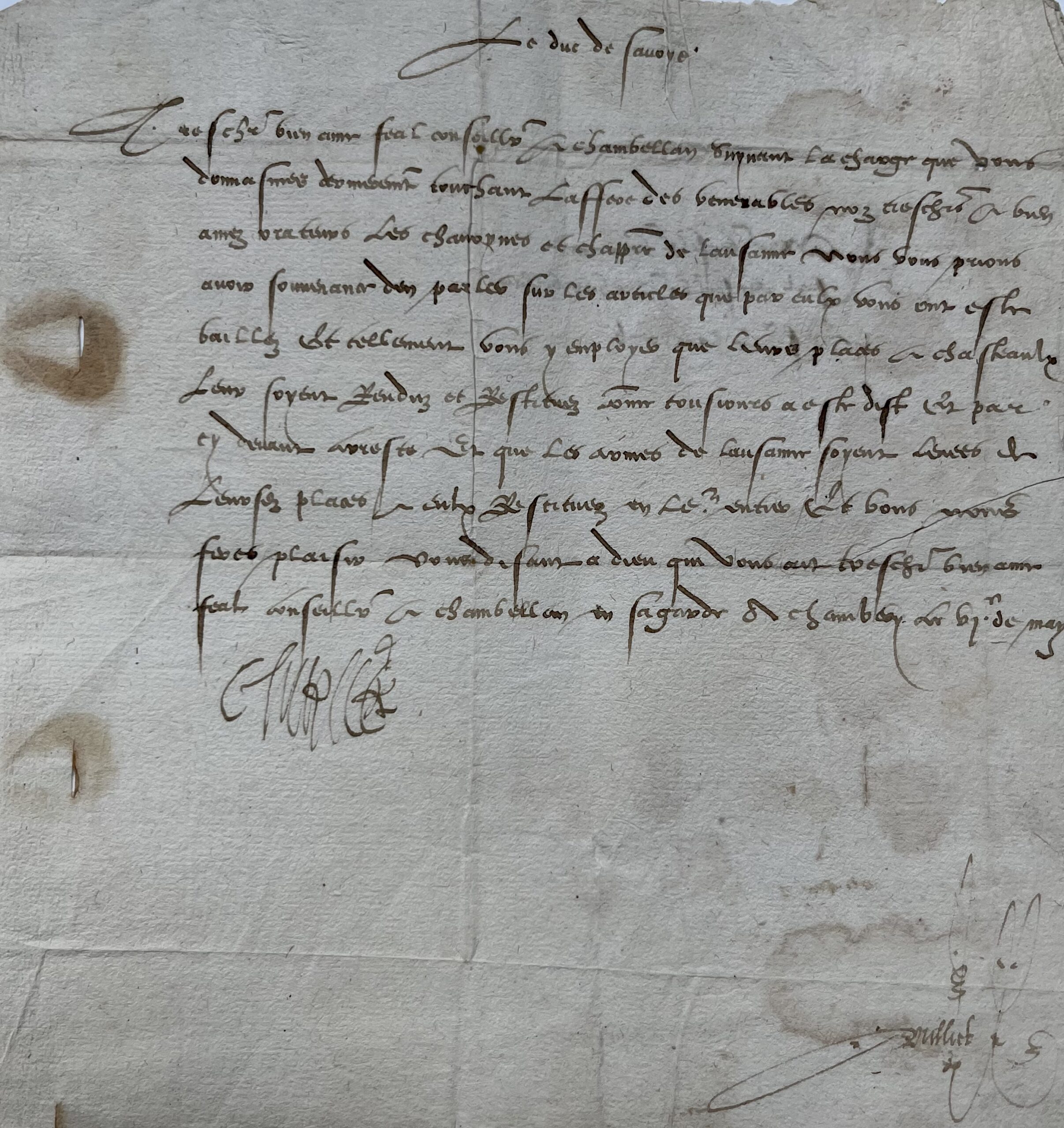 "Le duc de Savoye. Très cher bien aimé féal conseiller & chambellan suyvant la charge que vous donnasmes dernièrement touchant laffere des venerables noz tres chers & bien aimez orateurs les chanoynes et chappelins de Lausanne nous vous prions avoir souvenance den parler sur les aveulx que par eulx ont esté baillez et tellement vous y employez que leurs places & chasteaulx leur soyent renduz et restituez comme tousjours et estre dict et par cy devant arreste et que les armes de lausanne soyent levées de leurs dites places & à eulx restitueez […]".