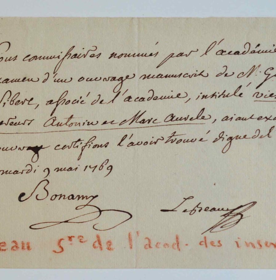«Nous commissaire nommés par l'Académie [des Inscriptions et Belles-Lettres] pour l'examen d'un ouvrage manuscrit de M. Gautier de Sibert, associé de l'Académie, intitulé Vies des empereurs Antonin et Marc Aurèle, aiant [sic] examiné cet ouvrage certifions l'avoir trouvé digne de l'impression.» Le livre devait en effet paraître à Paris, la même année.. Le document est écrit et signé par Charles Le Beau et signé également par Pierre Nicolas Bonamy.