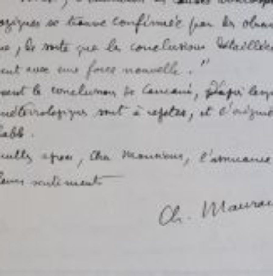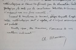 Charles Maurain renseigne Albert Ranc sur le sujet qu'il étudie, le renvoie à la lecture d'un ouvrage consacré à la science seismologique. «Il y a dans cet ouvrage tout un chapitre sur les "bruits seismologiques" auquel, d'après l'auteur et des auteurs qu'il cite, doivent être rattachés les bruits auxquels vous faites allusions, souvent abordés, et connus sous les noms de mistpoeffers (bruits de la brume) de la mer du Nord, misbrommen (bruits de brouillard), paperbags (bombes ou rots de la mer) [...]». Il l'invite à consulter l'ouvrage et lui en copie les conclusions.