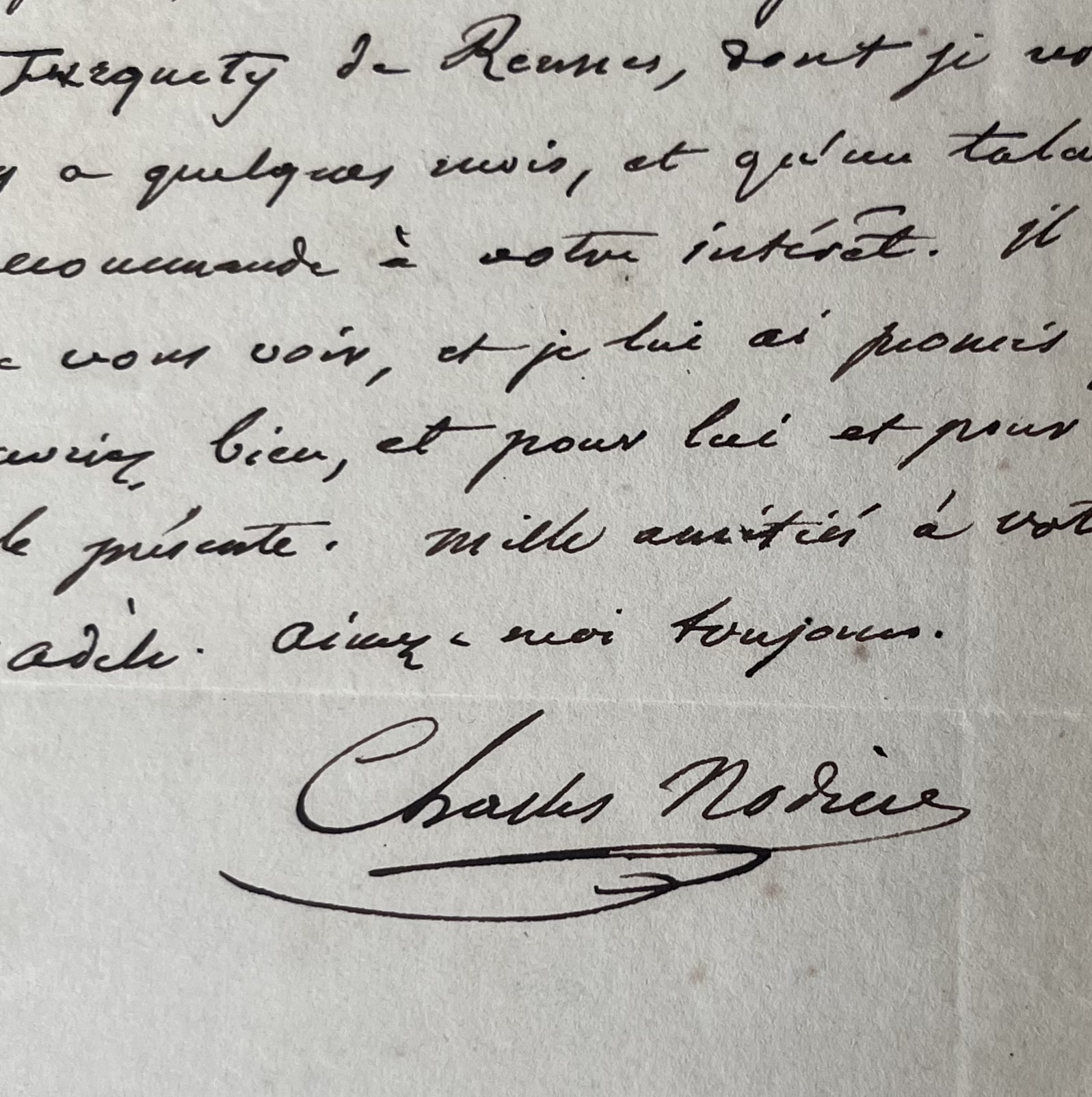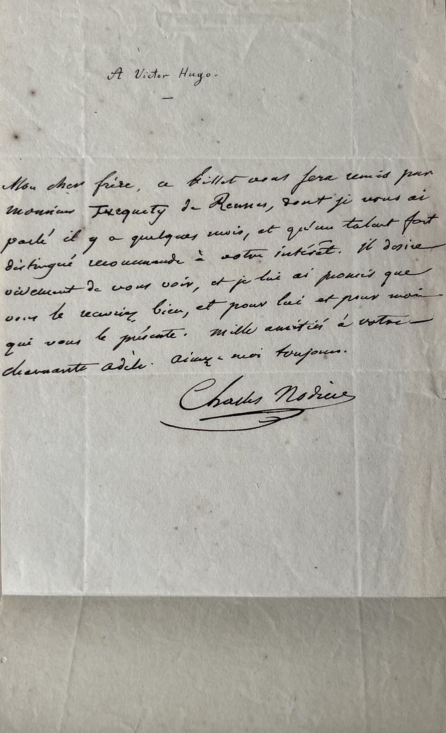 Charles Nodier (Besançon, 1780/1844)Charmante lettre de Charles Nodier adressée Victor Hugo. Il lui recommande un autre poète romantique rennais Édouard Turquety (