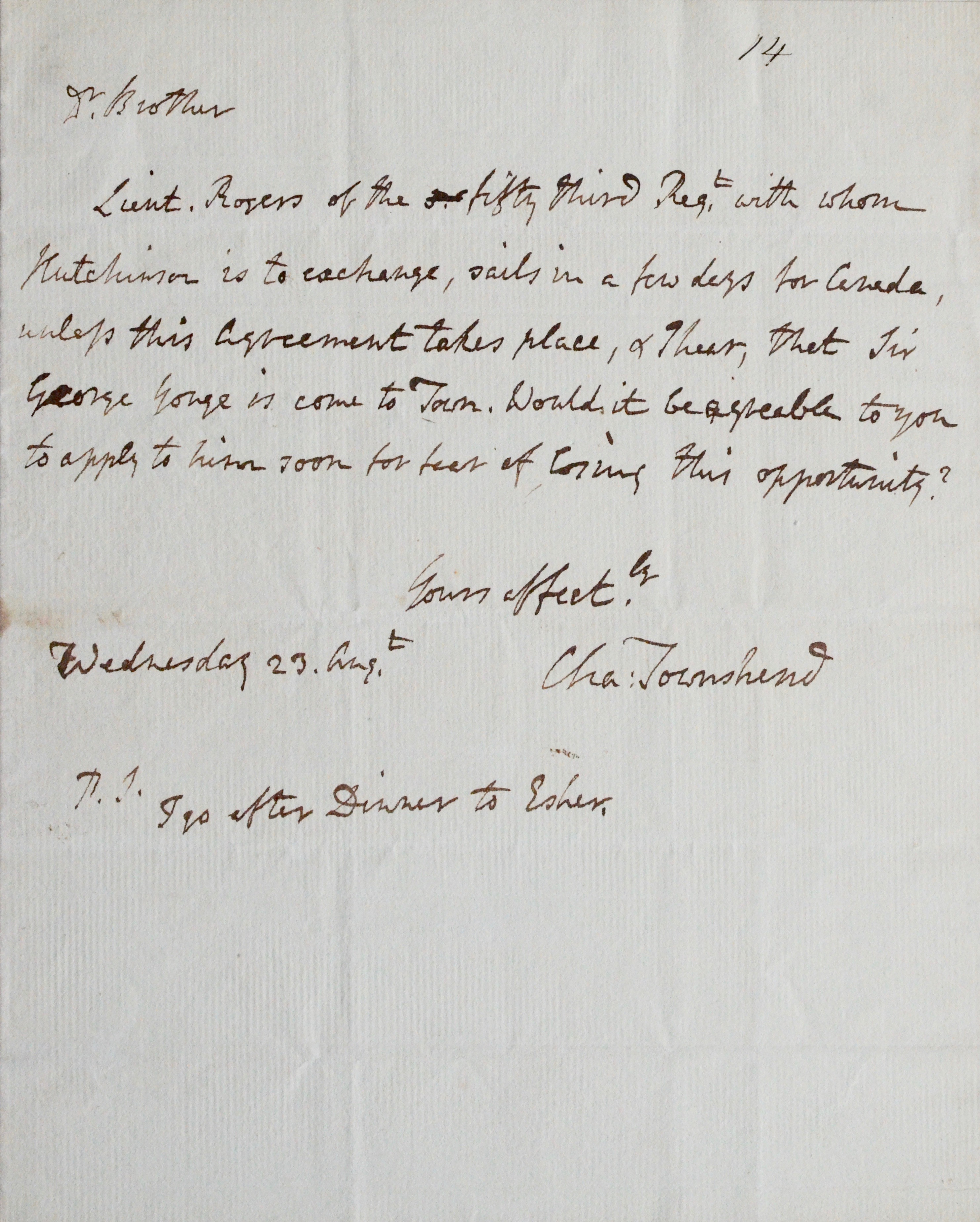 Il lui annonce que le lieutenant Rogers "of the fifty third Regiment" s'embarque dans quelques jours pour la Canada ("sails in a few days for Canada") ; il lui demande de fixer un rendez-vous rapidement avec lui. En post-scriptum, il ajoute : "I go after dinner to Esher".