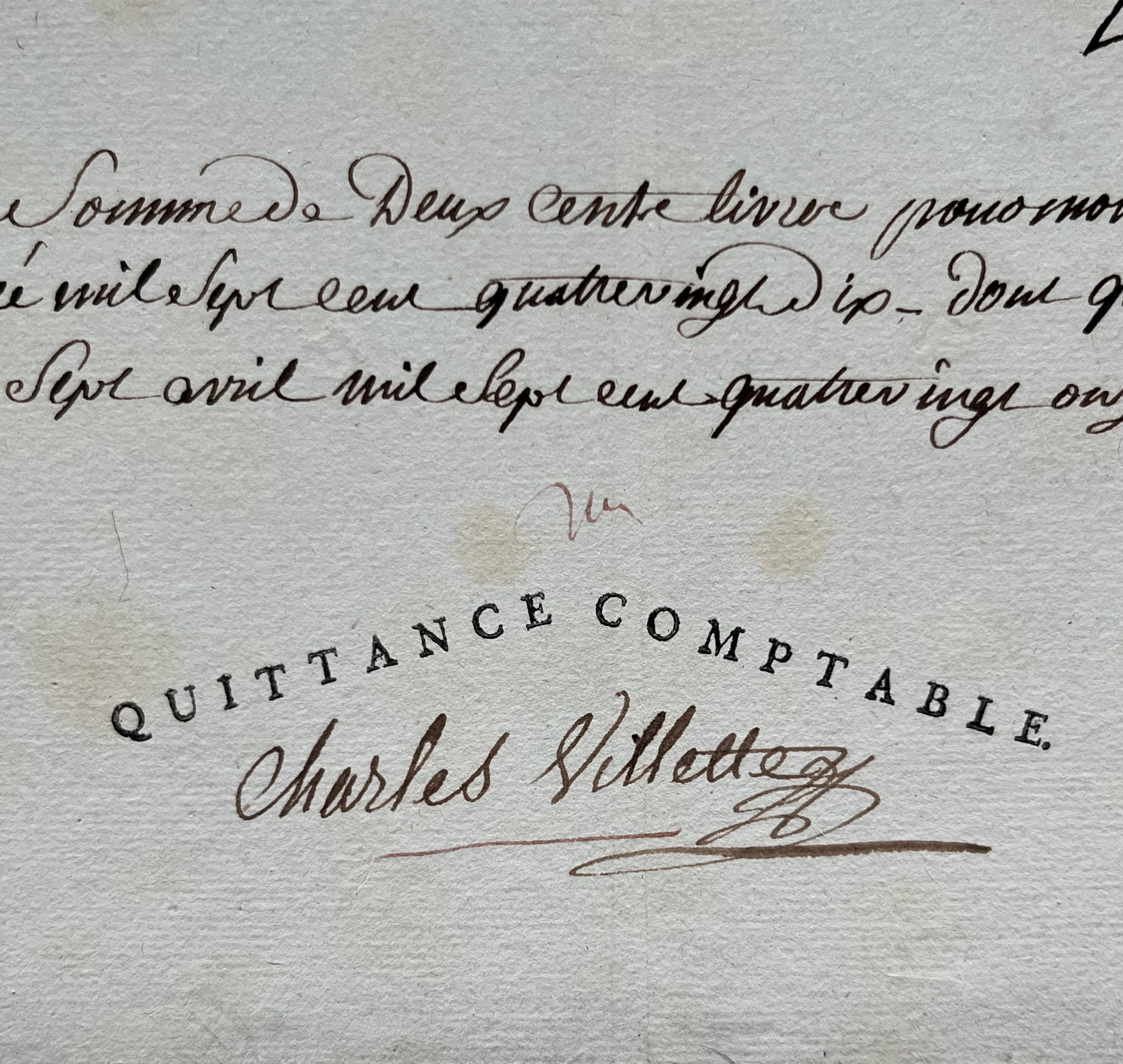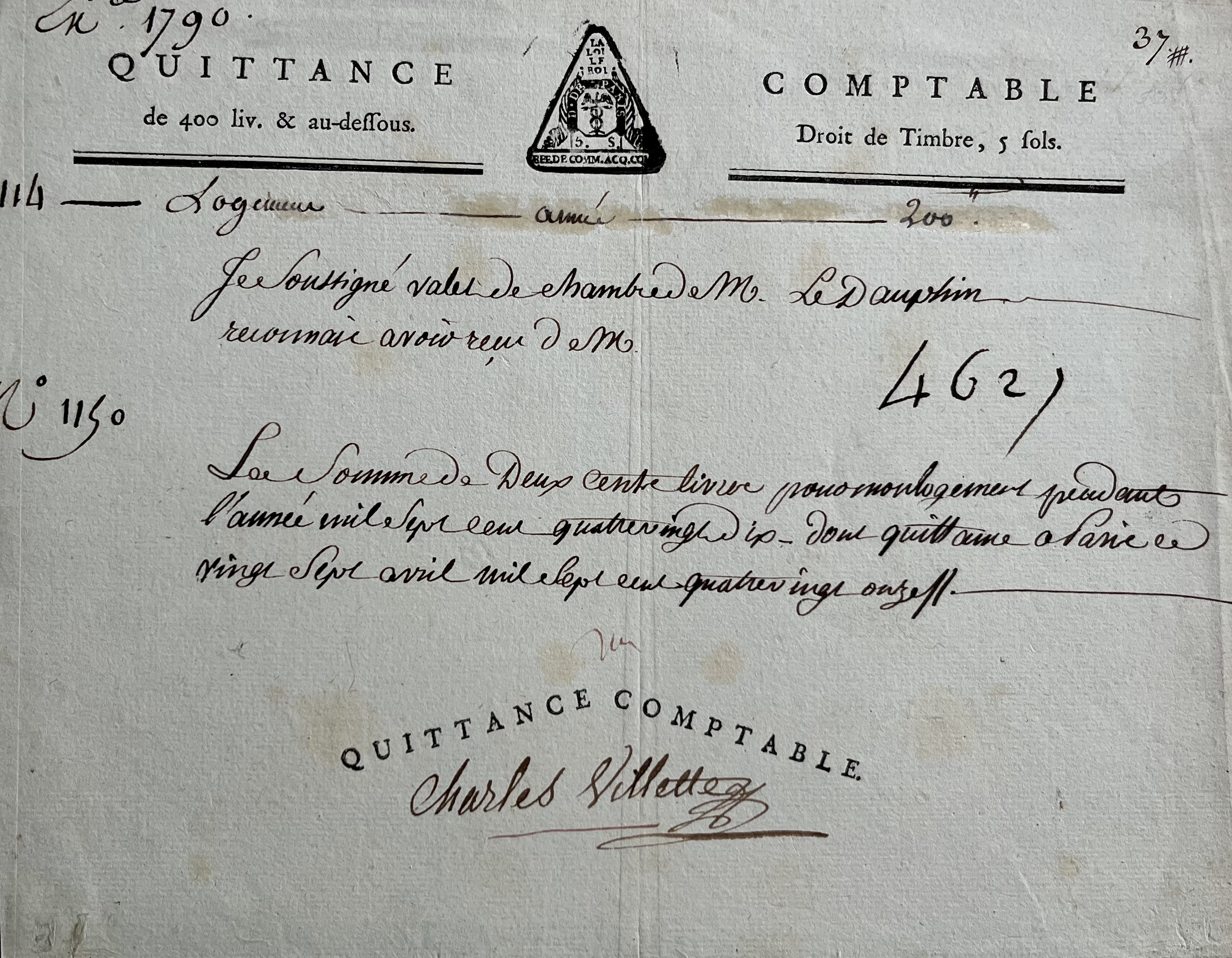 "Je soussigné valet de chambre de M. le Dauphin reconnais avoir reçu la somme de deux cents livres pour mon logement pendant l'année mil sept cent quatre-vingt dix [...]".