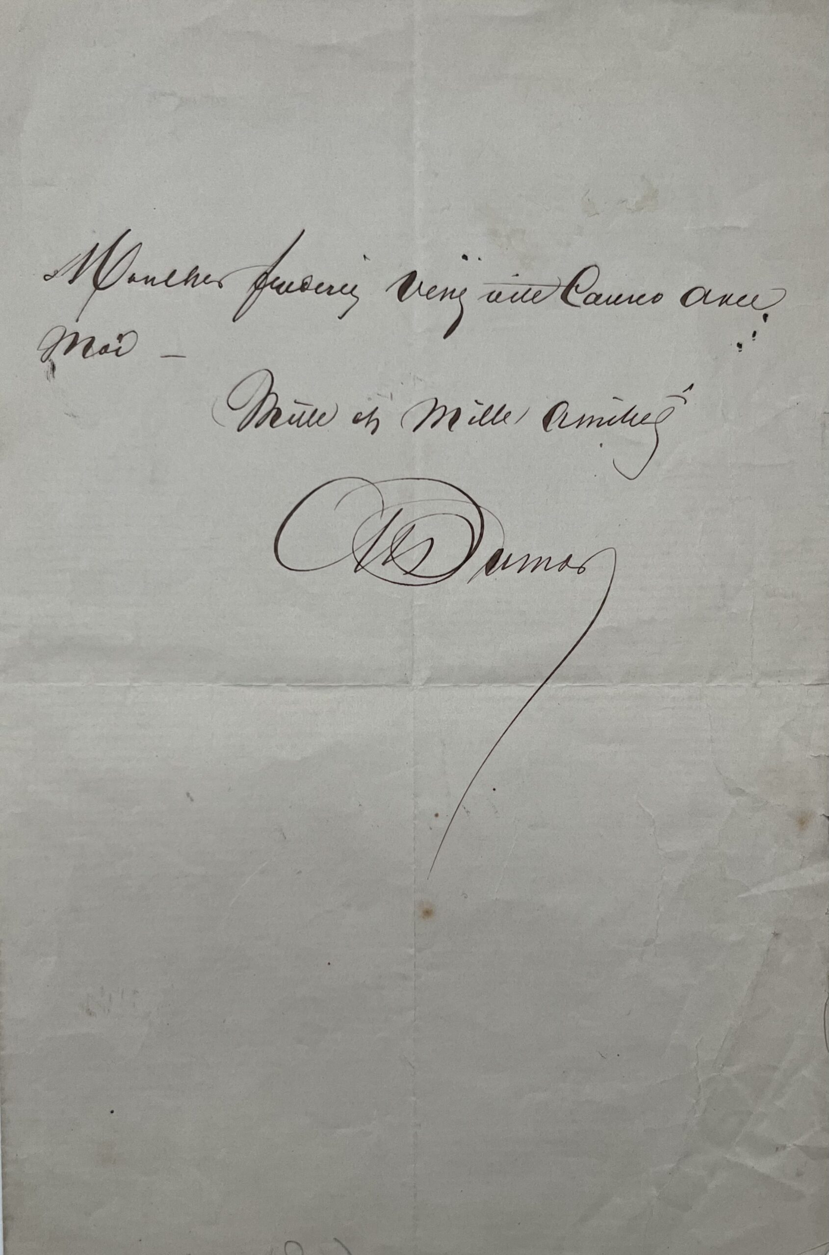 Charmant billet d'Alexandre Dumas père : "Mon cher Frederic venez vite causer avec moi. Mille et mille amitiés. Al Dumas".