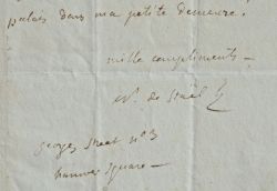 Charmant billet au jeune baron de Devonshire, écrit durant son exil en Angleterre. « Si vous n'étiez pas parti demain soir, Mylord, voudriez-vous vous reposer de vos palais dans ma petite demeure ? ». [A la mort de son père, en 1811, il avait hérité de 8 châteaux et 200.000 arpents de terre, soit plus de 800 km2].