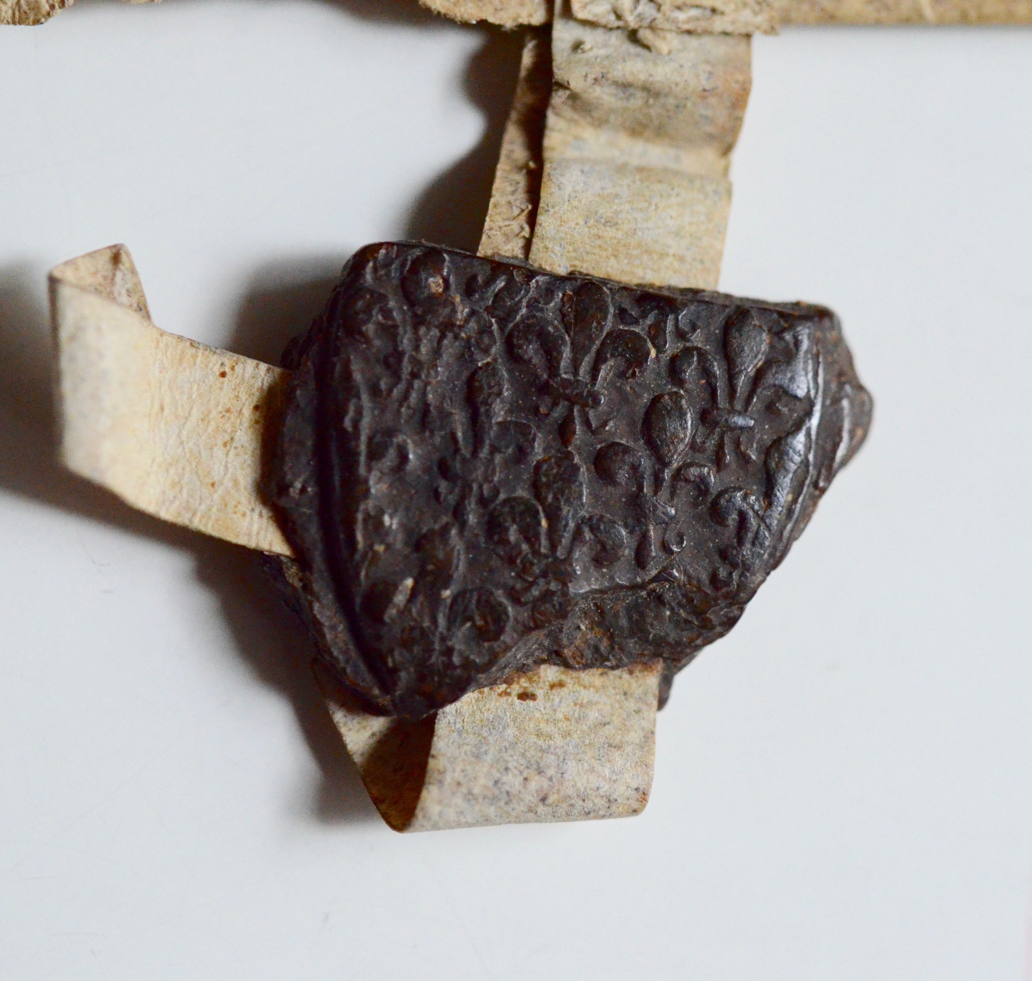 Parchemin avec très beau sceau de cire noire pendant sous double queue (semis de fleurs de lys sur un côté, blason de l'autre) d'environ 3 cm de diamètre.