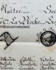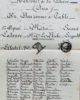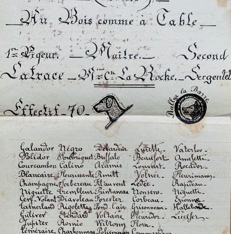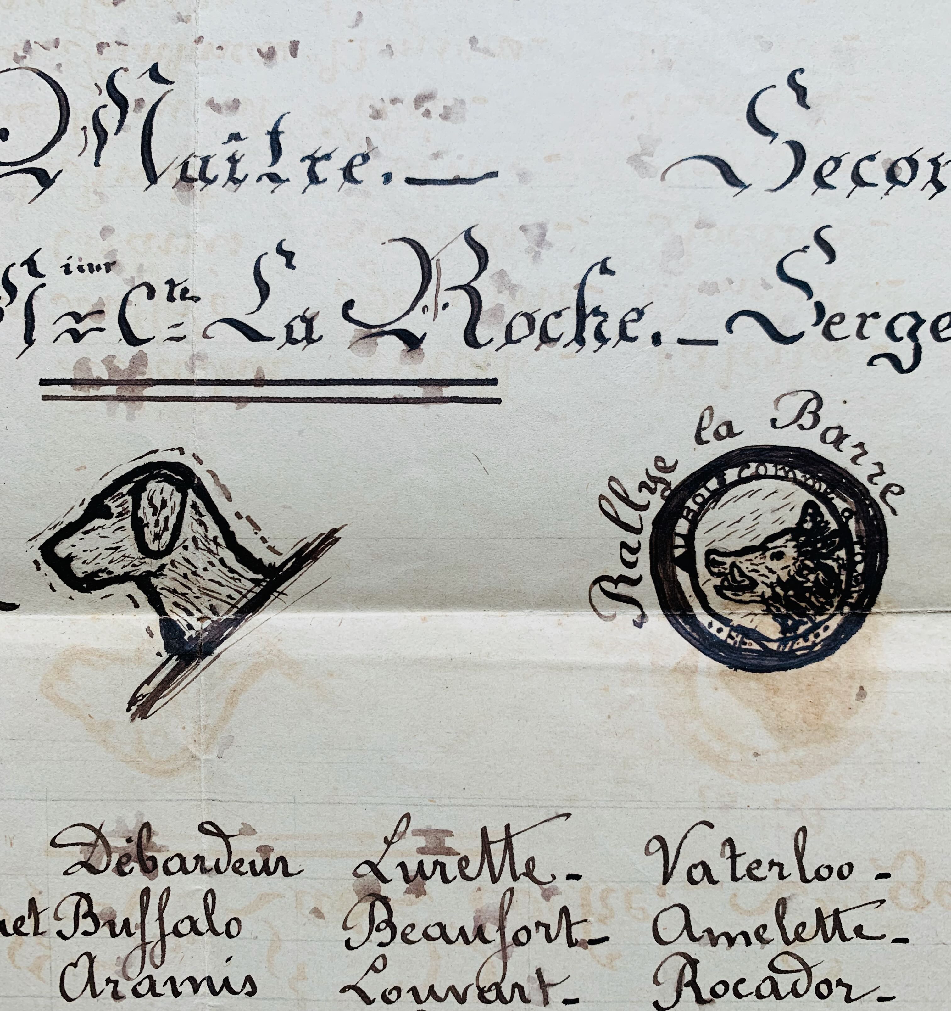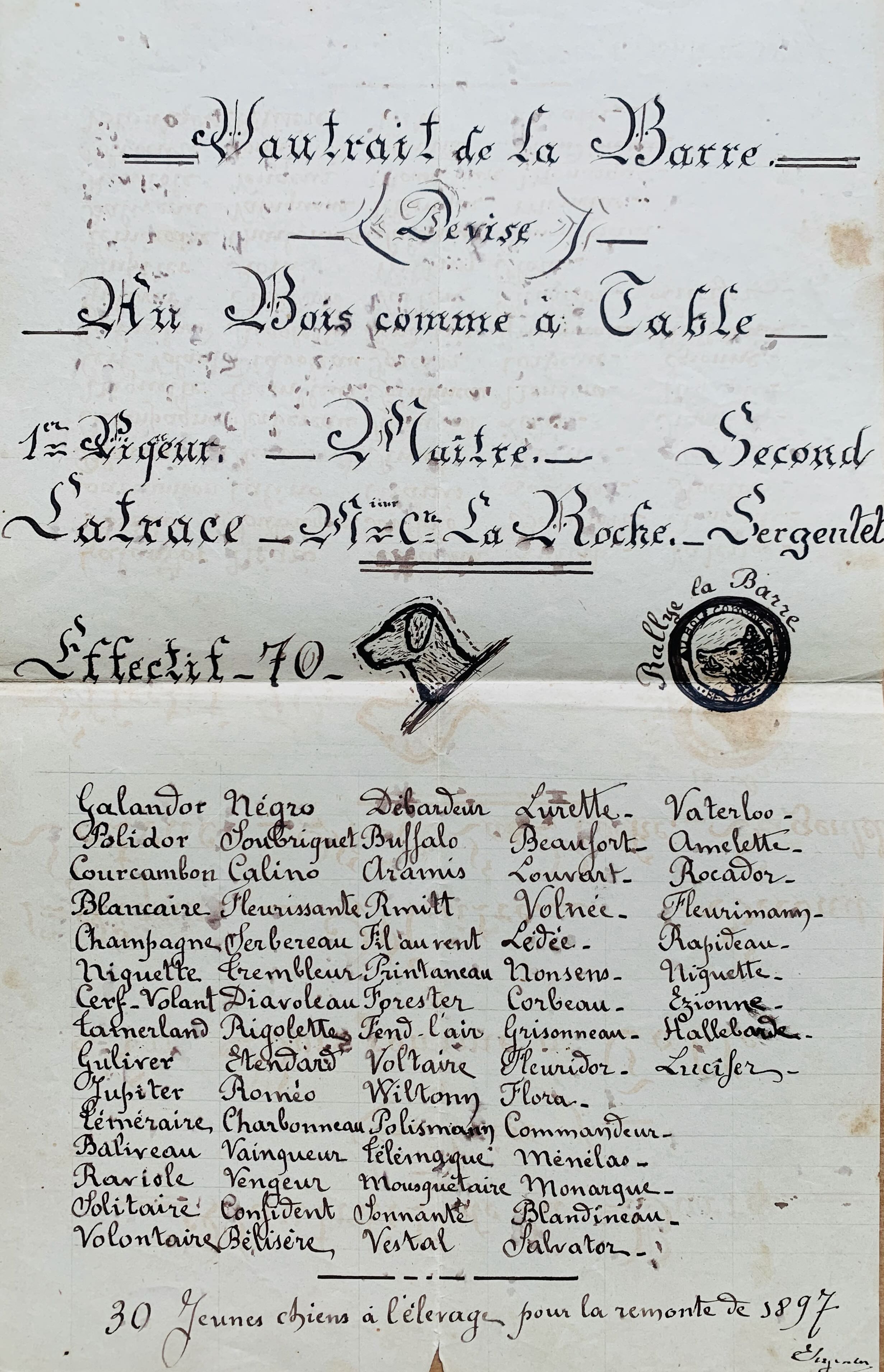 - grand feuillet orné de 2 petits dessins à la plume : « Vautrait de la Barre – Devise – Au Bois comme à Table », suivent les noms du maîtres, des 2 piqueur et des 7 chiens de la meute.