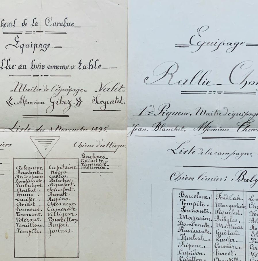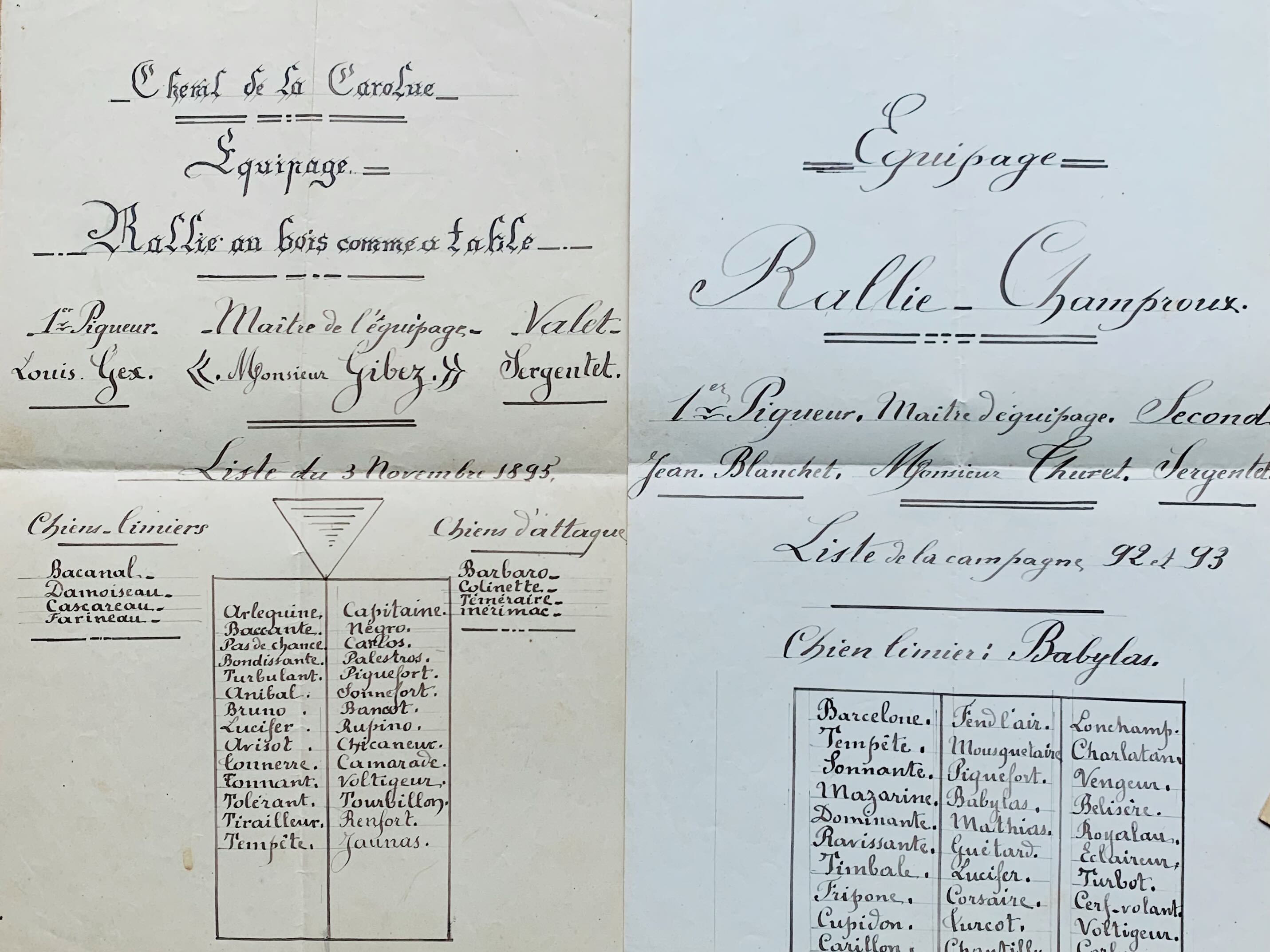 Chasse à courre au vautrait de la Barre (Allier) : ensemble de documents manuscrits fin XIXe