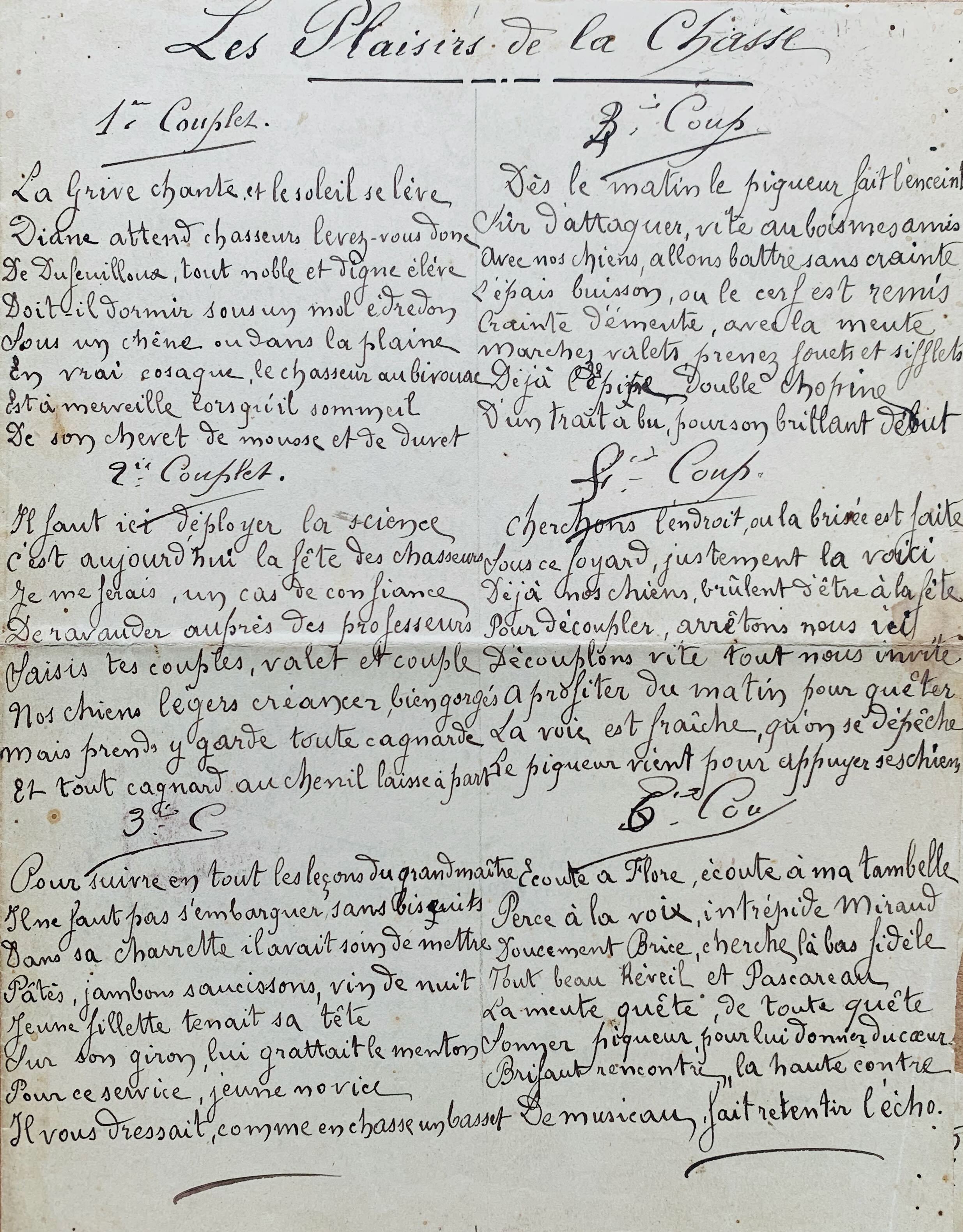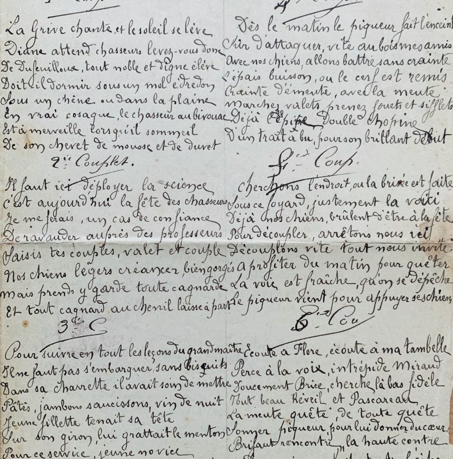 - chanson en 17 couplets « Les Plaisirs de la chasse » (4 pp. in-4) avec envoi à Sergentet au château de la Barre par Le Veurdre.