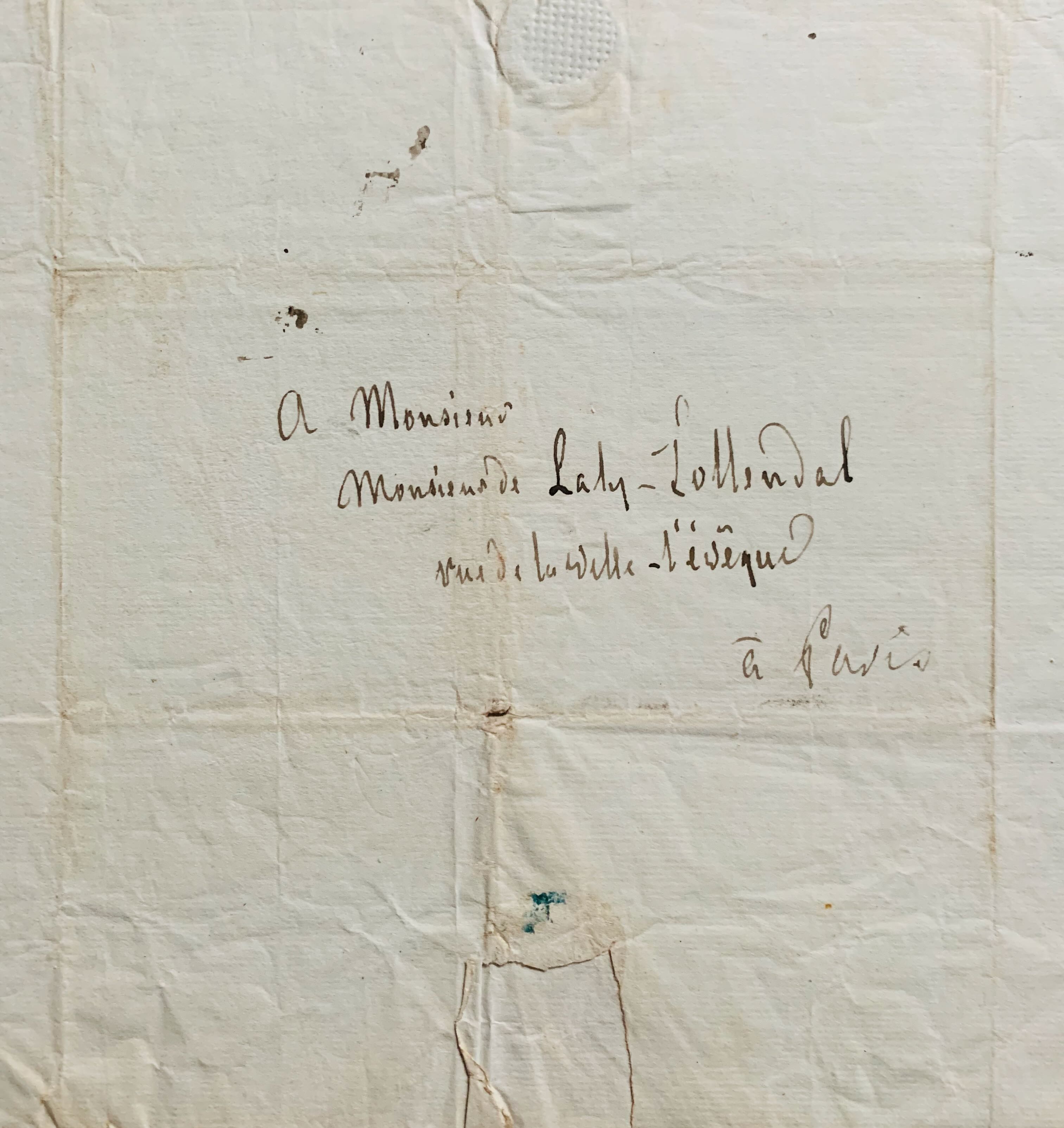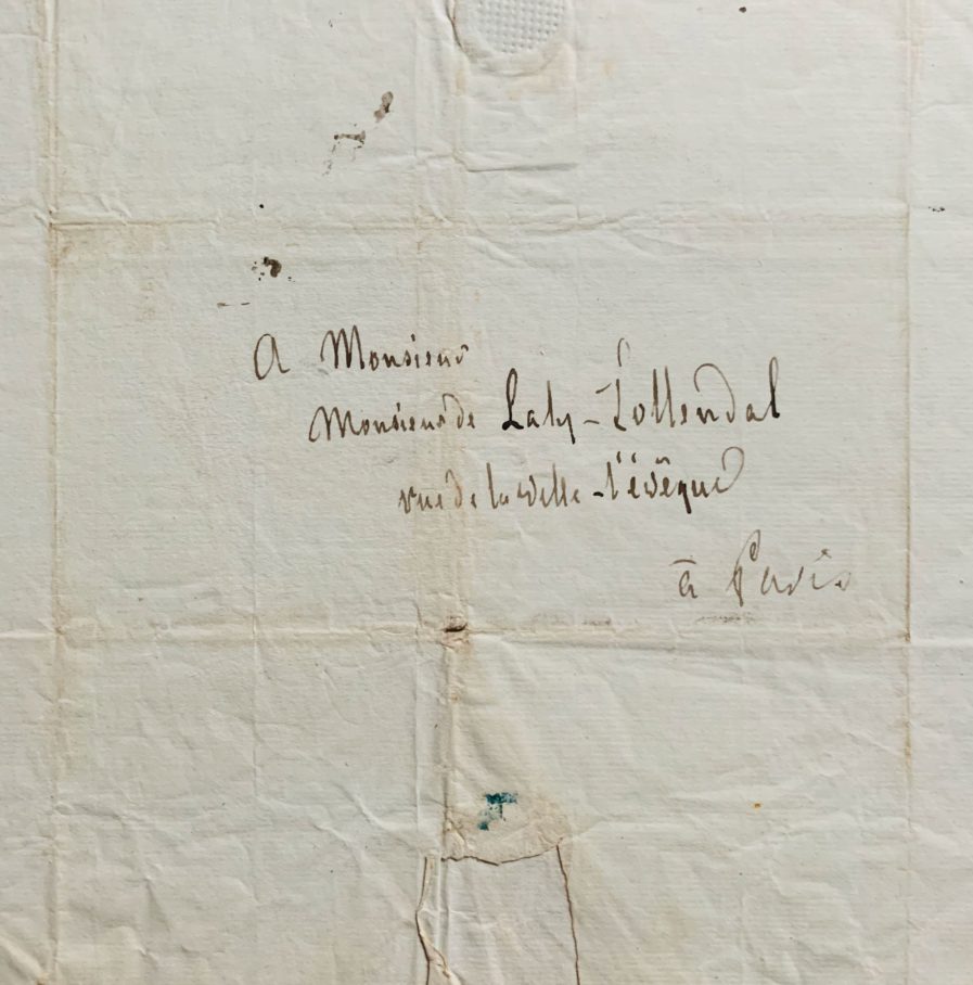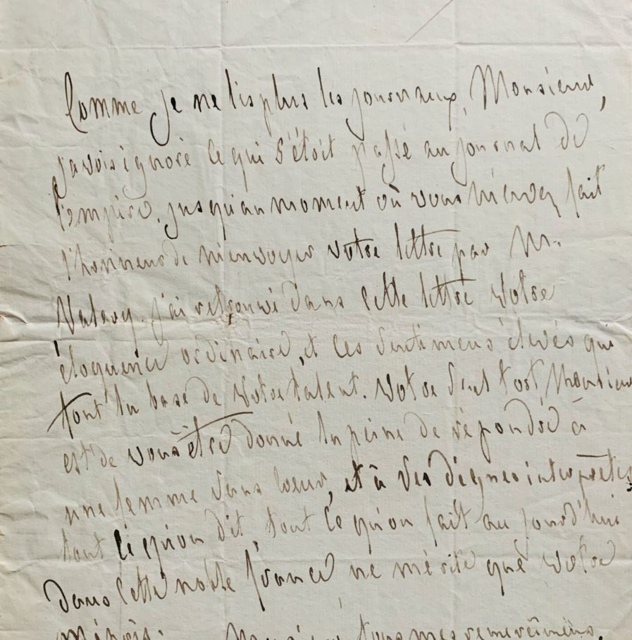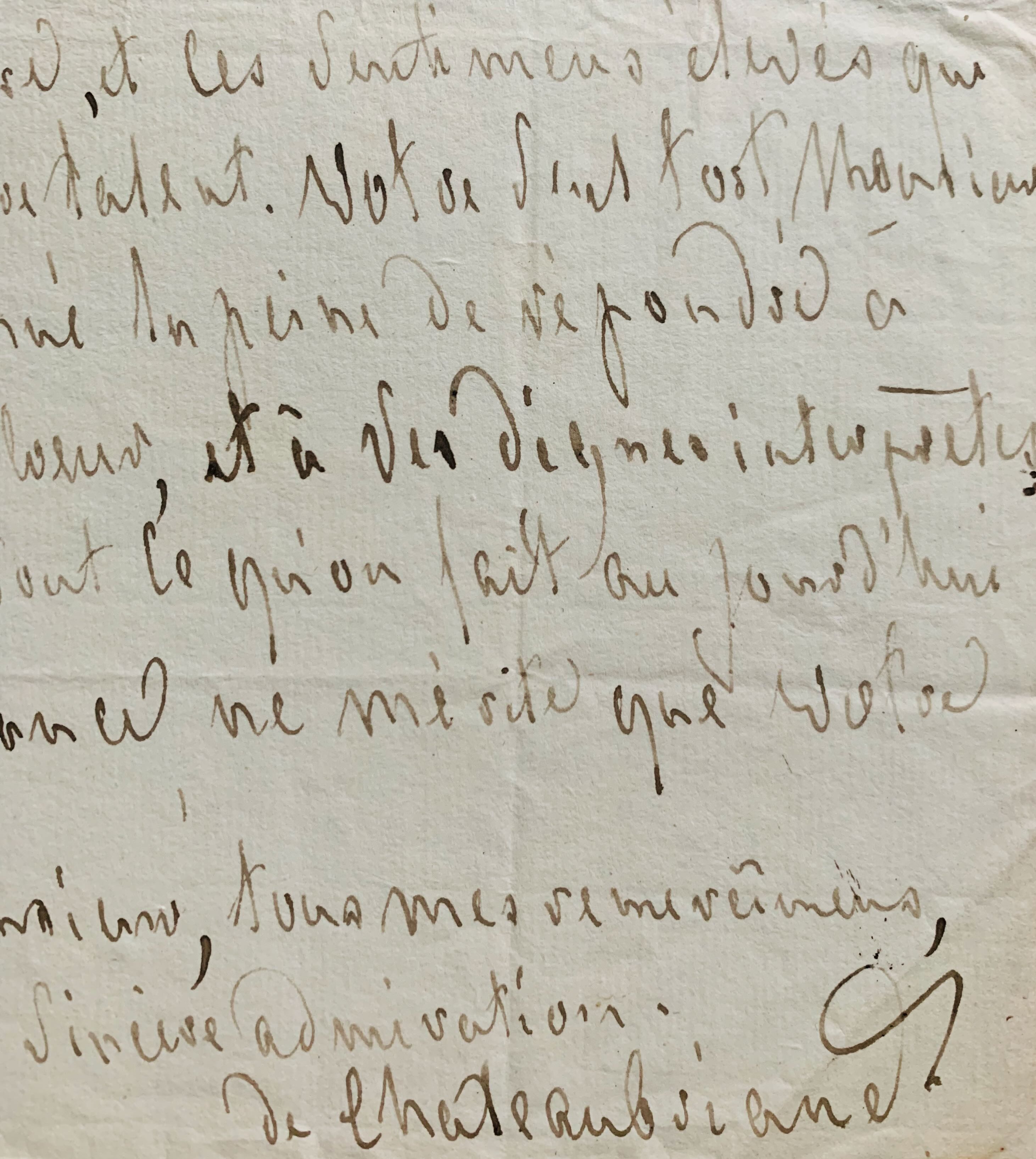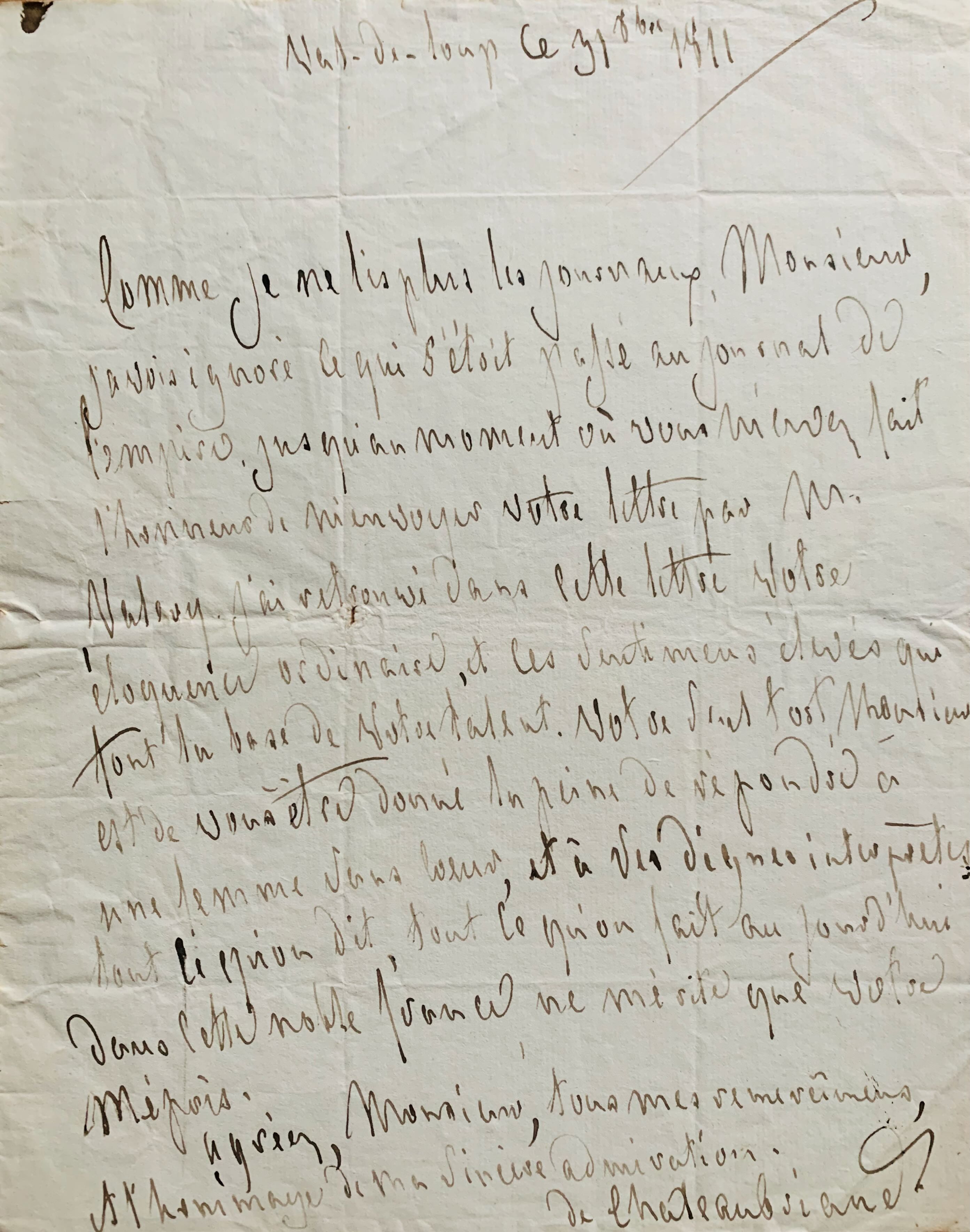 "Comme je ne lis plus les journaux, monsieur, j'avois ignoré ce qui s'étoit passé au Journal de l'empire, jusqu'au moment où vous m'avez fait l'honneur de m'envoyer votre lettre par M. Valery. J'ai retrouvé dans cette lettre votre éloquence ordinaire et ces sentiments élevés qui font la base de votre talent. Votre seul tort, Monsieur, est de vous être donné la peine de répondre à une femme sans coeur, et à ses dignes interprètes. Tout ce qu'on dit tout ce qu'on fait aujourd'hui dans cette noble France ne mérite que votre mépris.