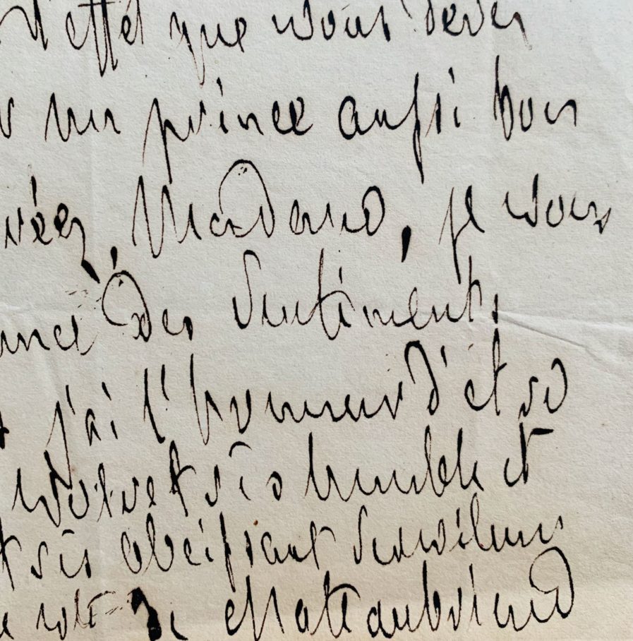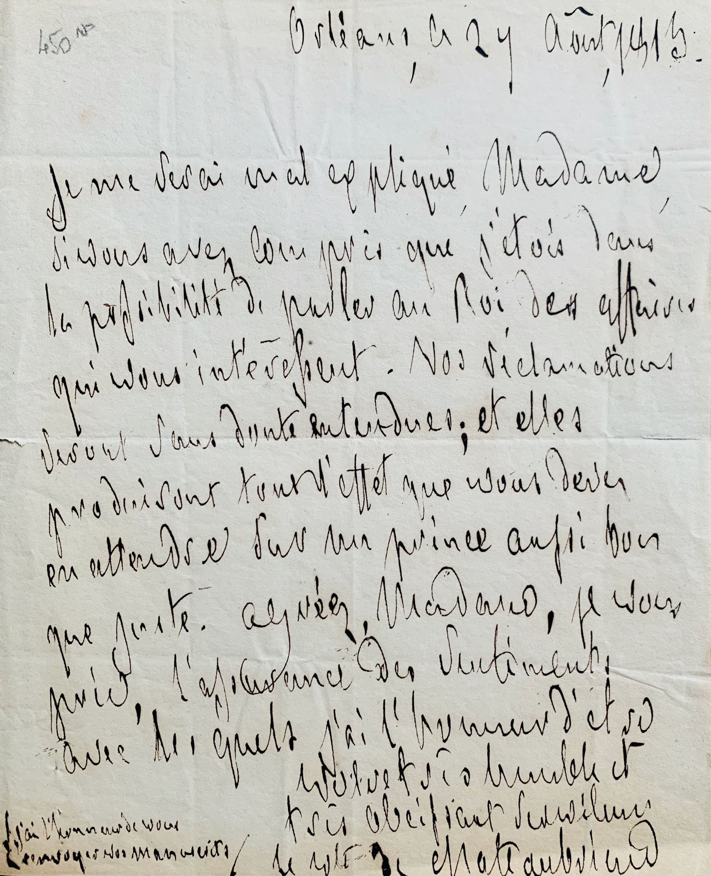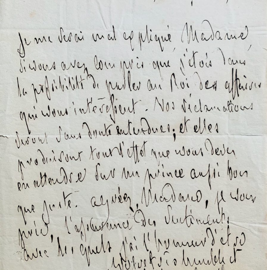 "Je me serai mal expliqué, Madame, si vous avez compris que j’étois dans la possibilité de parler au Roi des affaires qui vous intéressent. Vos réclamations seront sans doute entendues ; et elles produiront tout l’effet que vous devez en attendre sur un prince aussi bon que juste [...]".