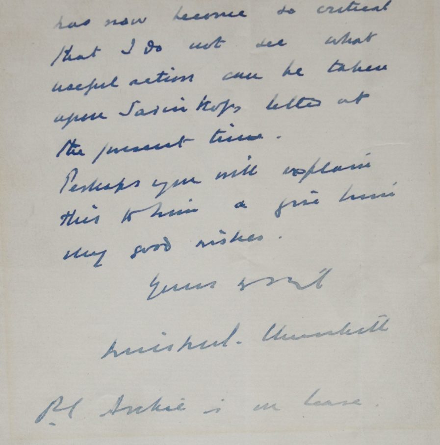 Intéressante lettre de Winston Churchill, vivement opposé au bolchévisme, qui s'inquiète de l'évolution de la situation dans le sud de la Russie. "The situation in S. Russia has now become so critical that I do not see what useful action can be taken upon Savinkoff letter at the present time. Perhaps you will explain this to him [...]". Churchill fait ici référence à la longue lettre de 6 pages que Savinkov lui a adressée, proposée sous la référence 10741 de notre catalogue en ligne. [Boris Savinkov (1879/1925), révolutionnaire russe, l'un des dirigeants de l'Organisation de combat des SR, la « Brigade terroriste » du Parti socialiste révolutionnaire].