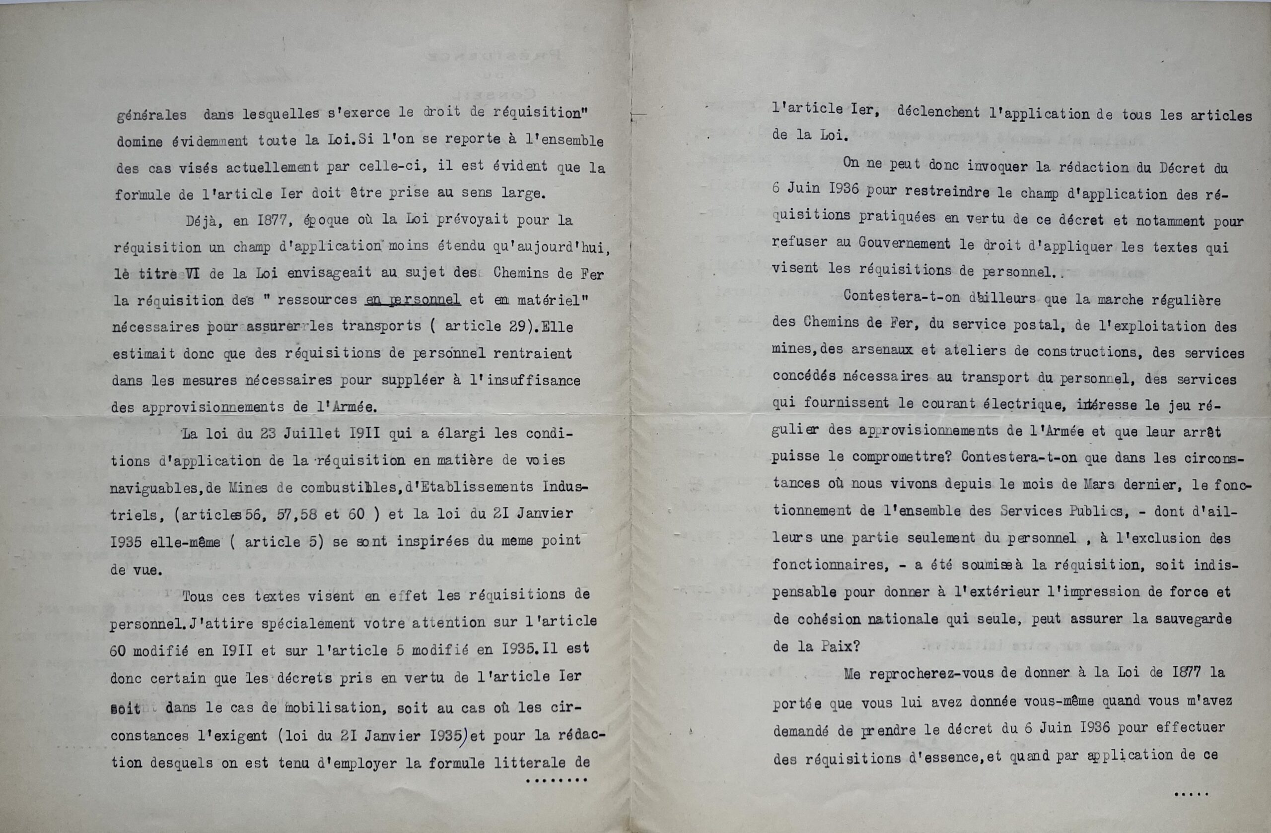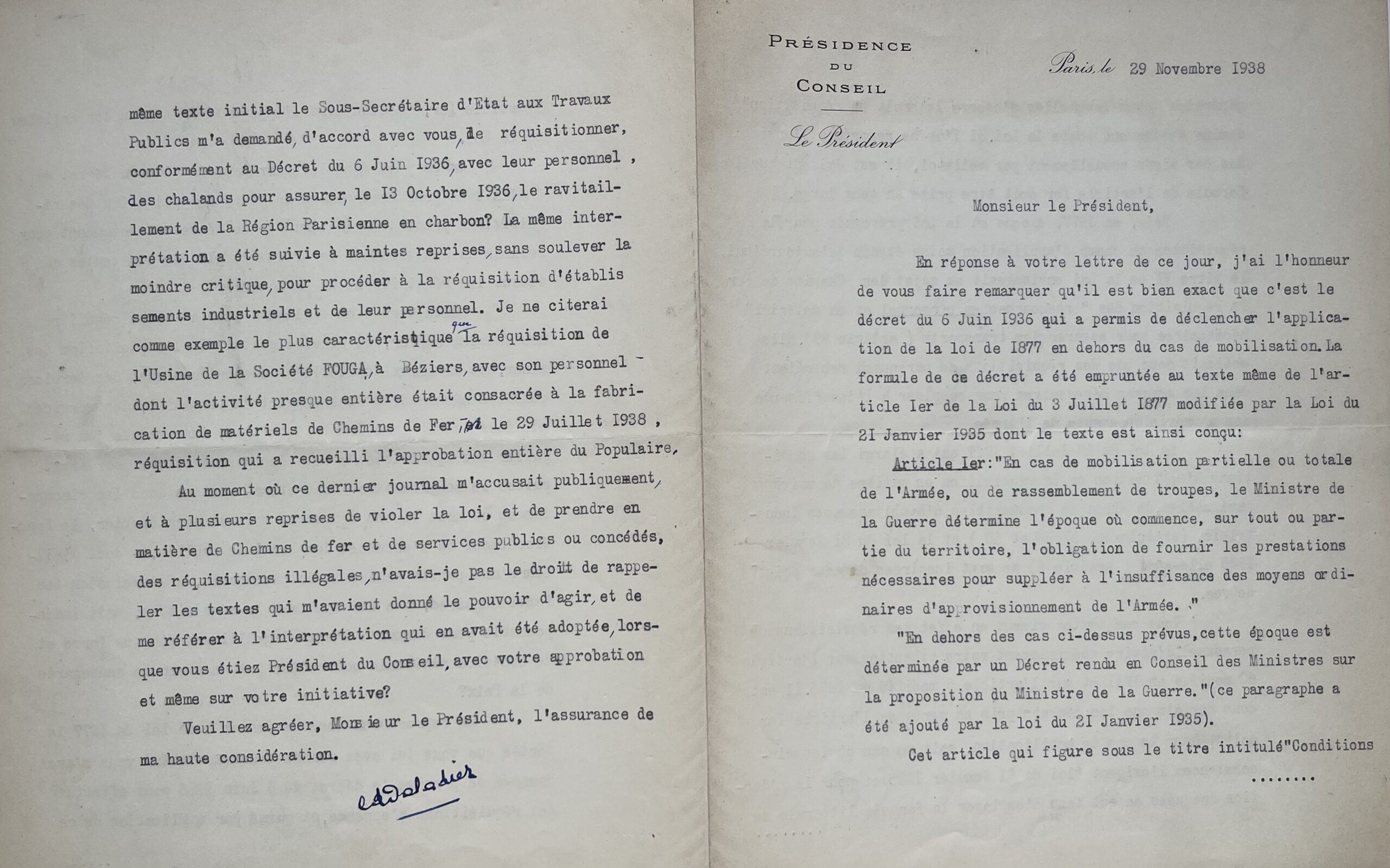 Daladier, dans un premier temps, rappelle et détaille l’esprit et la portée des décrets qu’il a pris, puis répond avec véhémence : "[...] Me reprocherez-vous de donner à la Loi de 1877 la portée que vous lui avez donnée vous-même quand vous m’avez demandé de prendre le décret du 6 juin 1936 pour effectuer des réquisitions d’essence, et quand par application de ce même texte initial le sous-secrétaire d’État aux Travaux Publics m’a demandé, d’accord avec vous, de réquisitionner, conformément au Décret du 6 juin 1936, avec leur personnel, des chalands pour assurer, le 13 octobre 1936, le ravitaillement de la Région Parisienne en charbon ? La même intervention a été suivie à maintes reprises, sans soulever la moindre critique, pour procéder à la réquisition d’établissements industriels et leur personnel. Je ne citerai comme exemple le plus caractéristique que la réquisition de l’Usine de la Société FOUGA, à Béziers, avec son personnel dont l’activité presque entière était consacrée à la fabrication de matériels de Chemins de Fer, le 29 juillet 1938, réquisition qui a recueilli l’approbation entière du Populaire. Au moment où ce dernier journal m’accusait publiquement, à plusieurs reprises de violer la loi, et de prendre en matière de Chemins de fer et de services publics ou concédés, des réquisitions illégales, n’avais-je pas le droit de rappeler les textes qui m’avaient donné le pouvoir d’agir, et de me référer à l’interprétation qui en avait été adoptée, lorsque vous étiez Président du Conseil, avec votre approbation et même sur votre initiative ? [...]".
