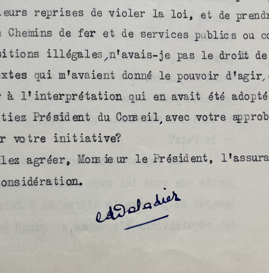 Cinglante lettre d’Edouard Daladier à Léon Blum en réponse aux mesures contre les grèves de 1938