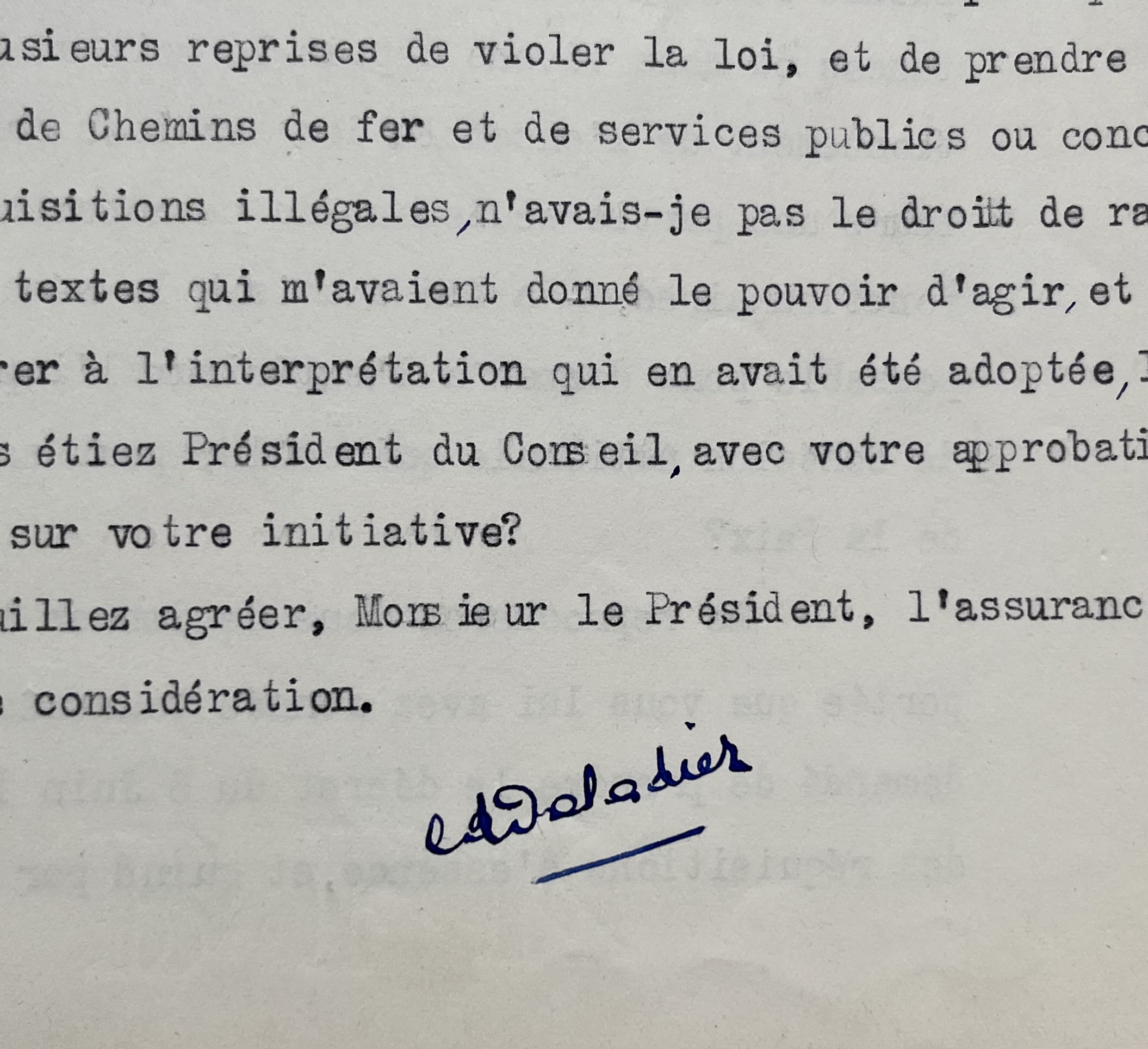 Edouard Daladier (Carpentras, 1884/1970)Longue et cinglante lettre d'Édouard Daladier en réponse à Blum sur les réquisitions, lui rétorquant qu’il les avait lui-même initiées et utilisées sous le Front Populaire.
