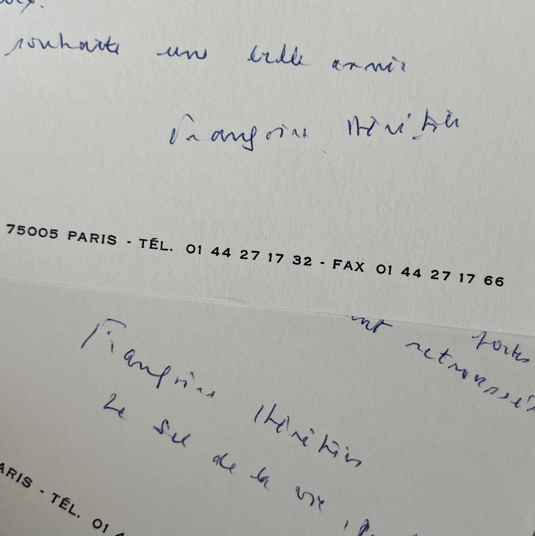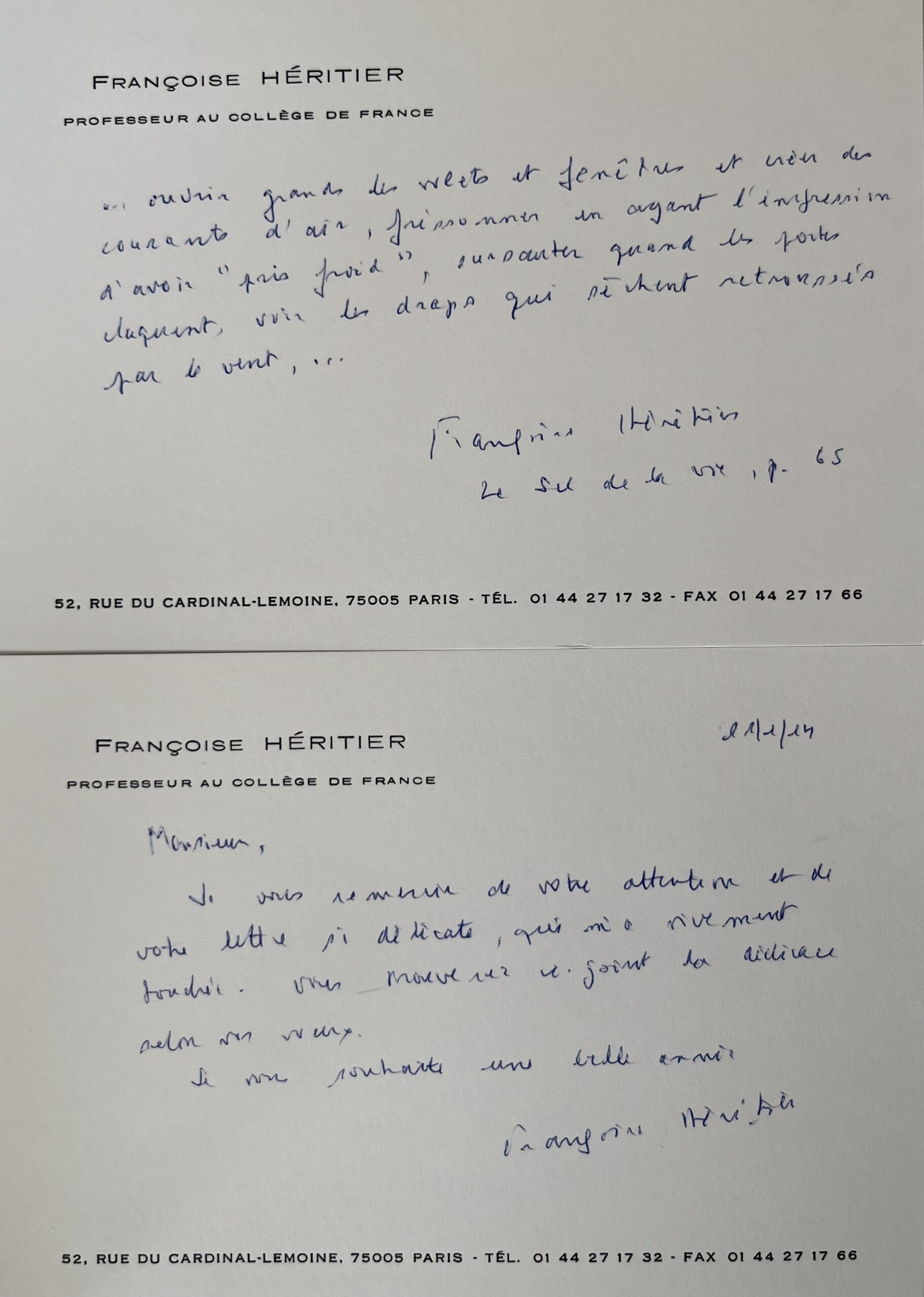 - Sur une carte à son en-tête de professeur au Collège de France, Françoise Héritier a copié un extrait du Sel de la vie, p. 65 : "... ouvrir grands les volets et les fenêtres et créer des courants d'air, frissonner en ayant l'impression d'avoir "pris froid", sursauter quand les portes claquent, voir les draps qui sèchent retroussés par le vent ...."
