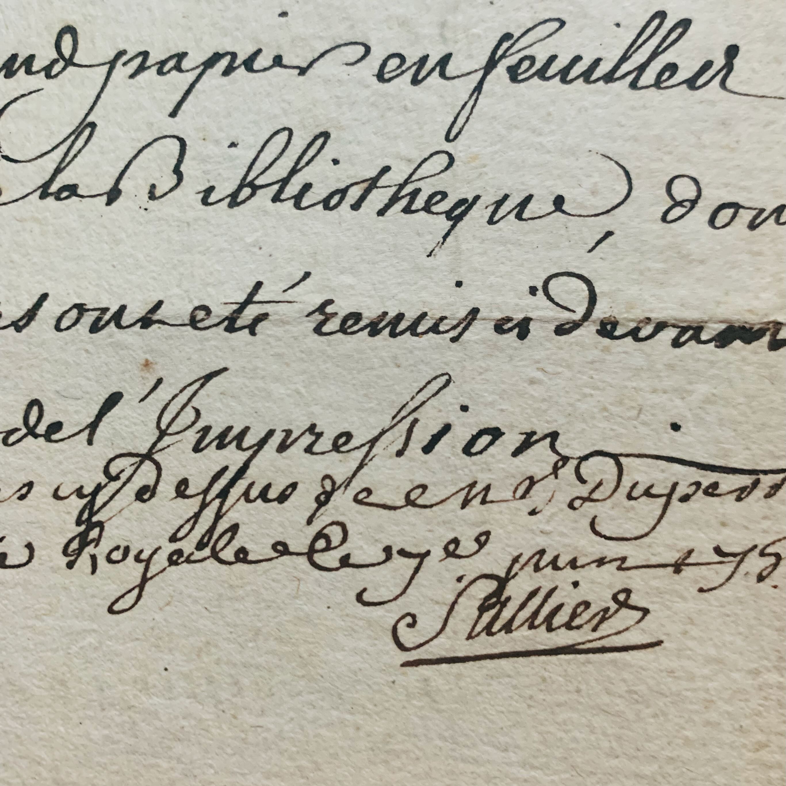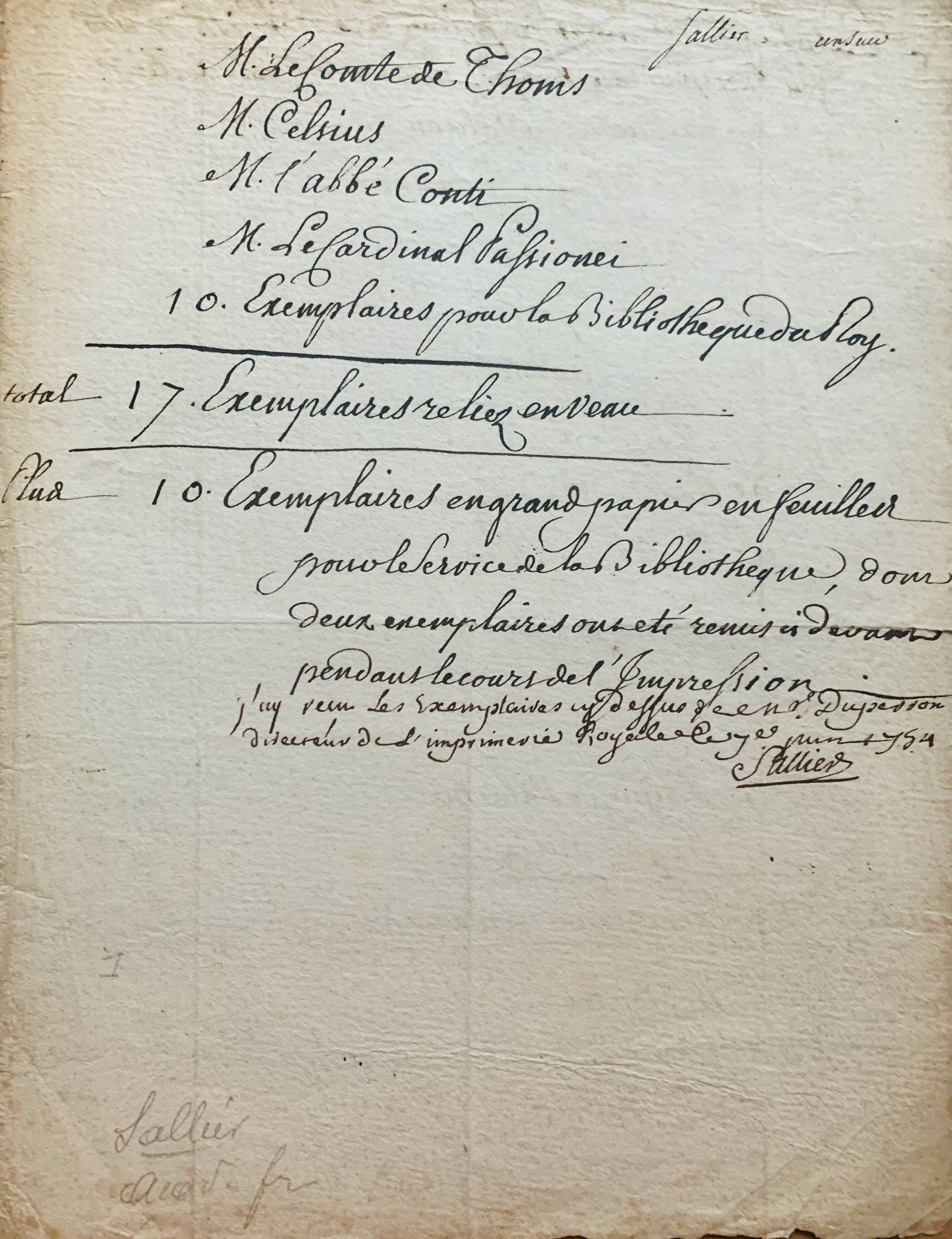 A la suite d'une liste d'ouvrages remis par Duperron, directeur de l'imprimerie royale, Claude Sallier, garde des imprimés de la Bibliothèque du roi, accuse réception de 41 volumes. 14 sont reliés en maroquin, 17 en veau et 10 "en grand papier en feuilles pour le service de la Bibliothèque, dont deux exemplaires ont été remis ci-devant pendant le cours de l'impression". Rare.