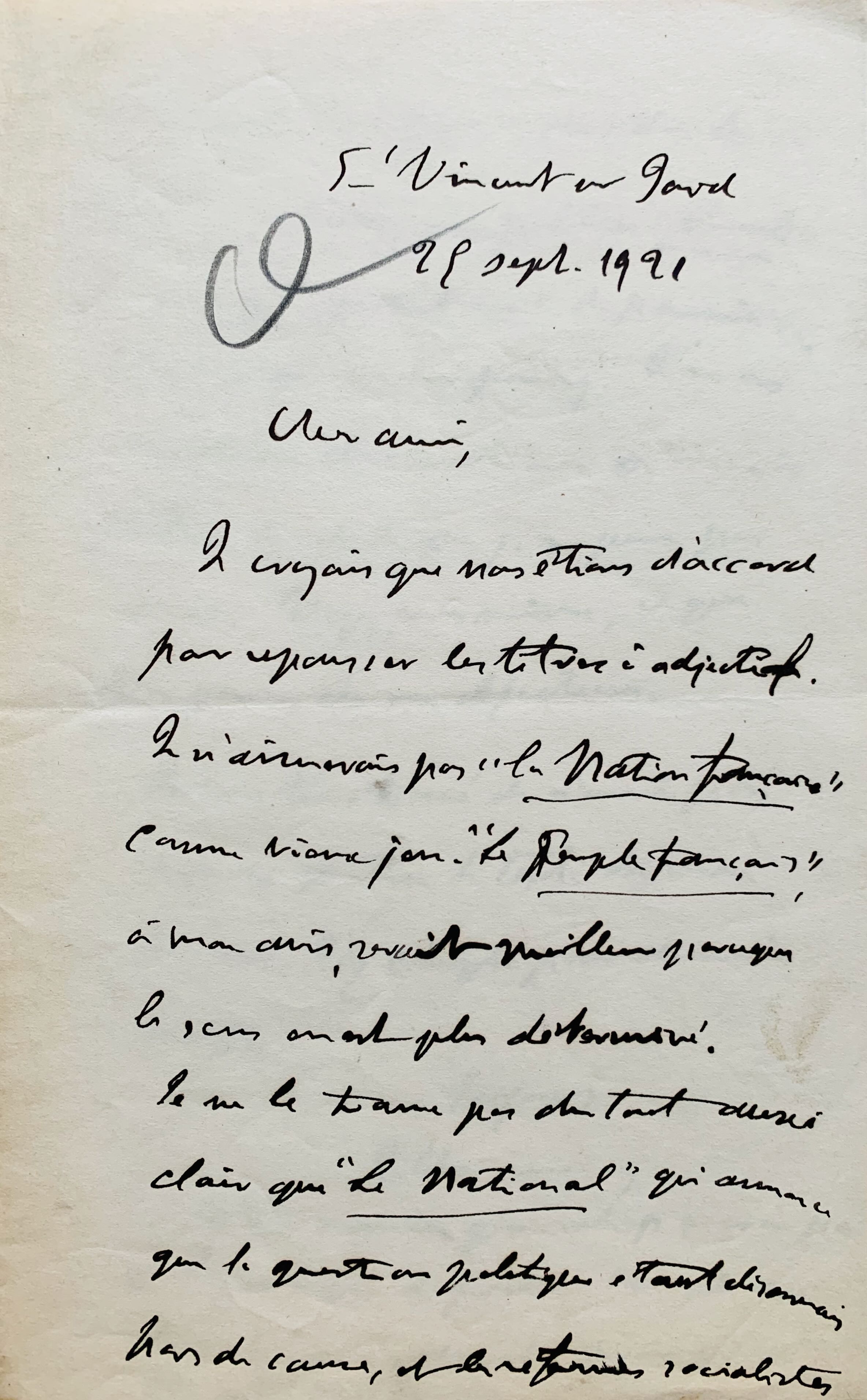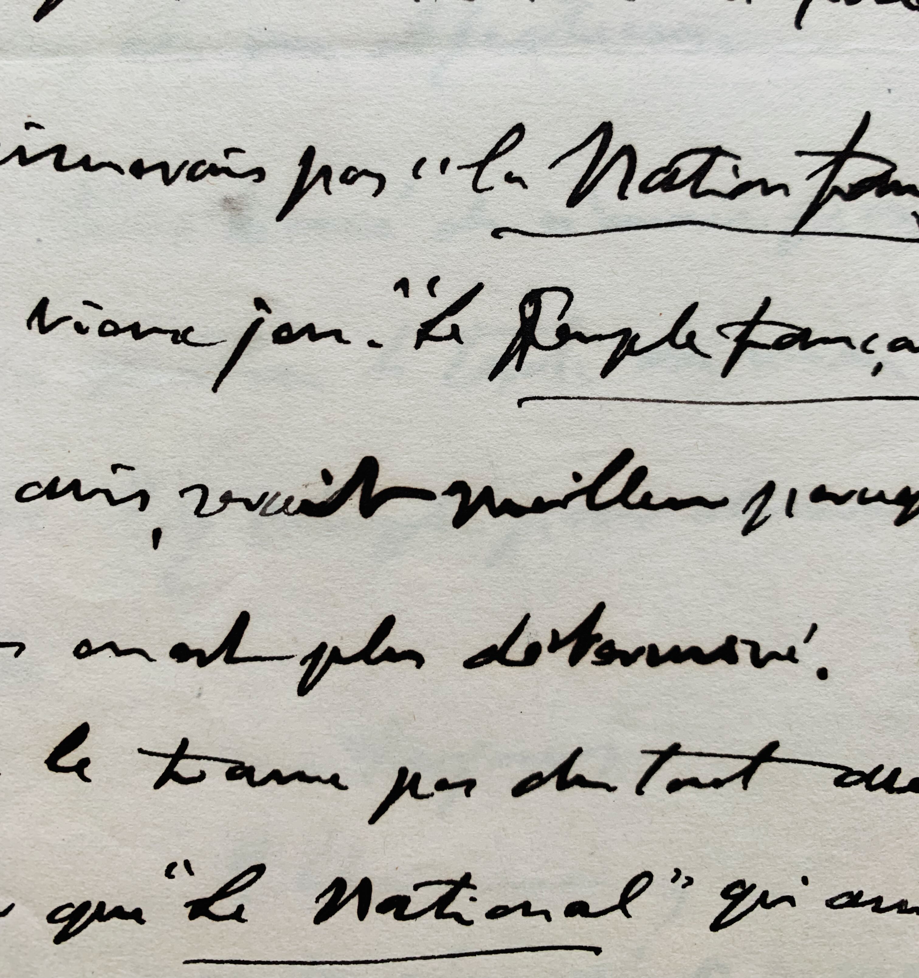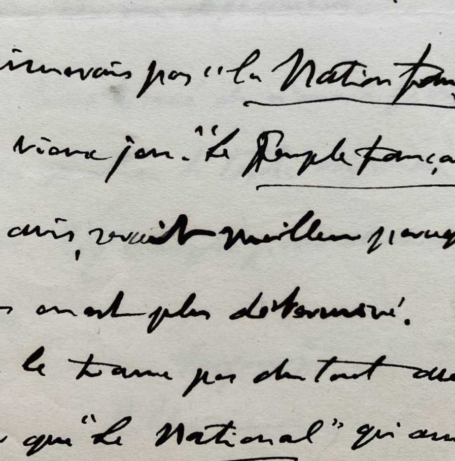 Georges Clemenceau (Mouilleron-en-Pareds, 1841/1929)"Je croyais que nous étions d'accord pour repousser les titres à adjectif. Je n'aimerais pas "La Nation française" comme vieux jeu. "Le Peuple français", à mon avis, serait meilleur, parce que le sens en est plus déterminé.