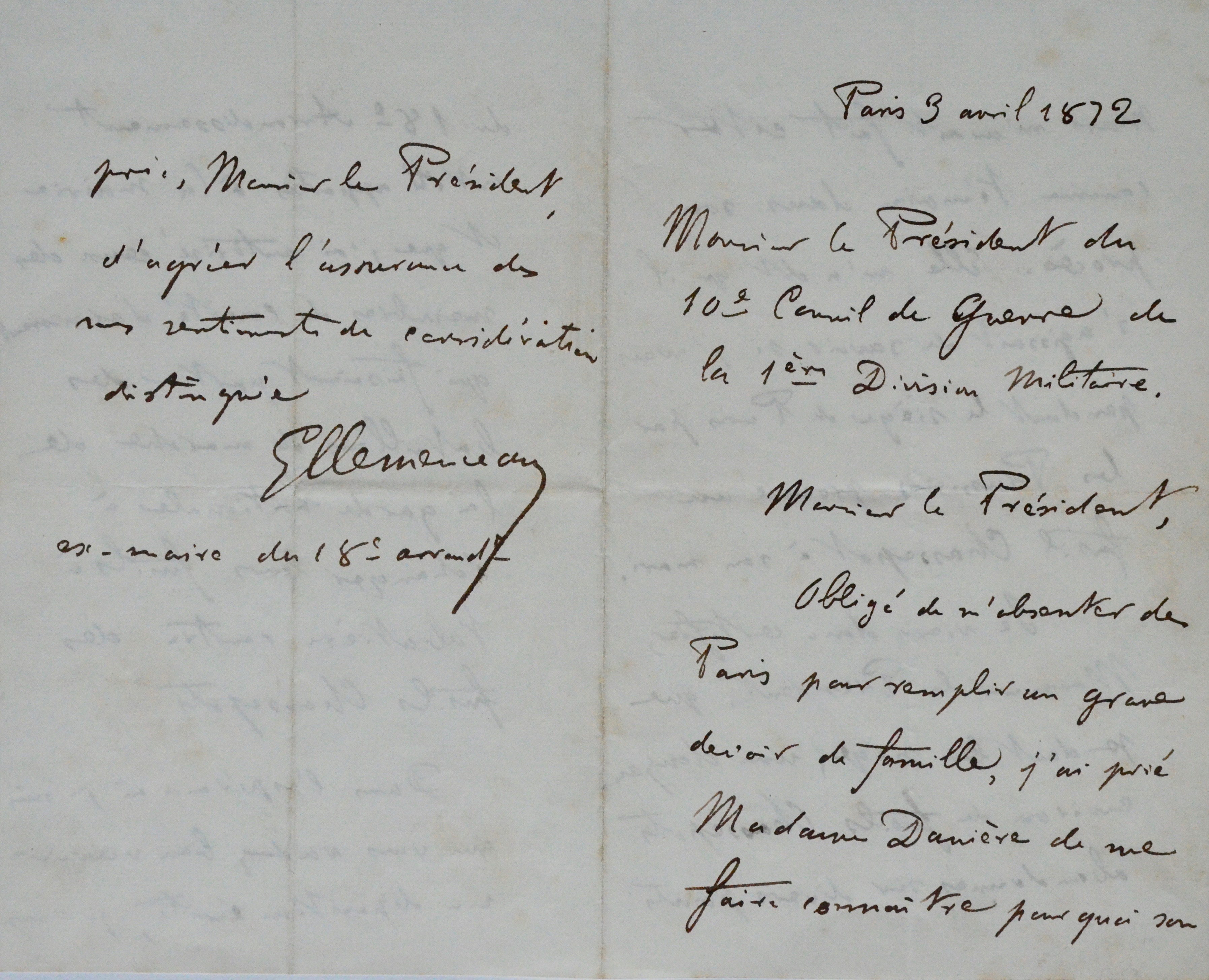 Georges Clemenceau (Mouilleron-en-Pareds, 1841/1929)Absent à un procès dans lequel il était cité à comparaître, Georges Clemenceau donne sa version par écrit d'un événement survenu lors du Siège de Paris :