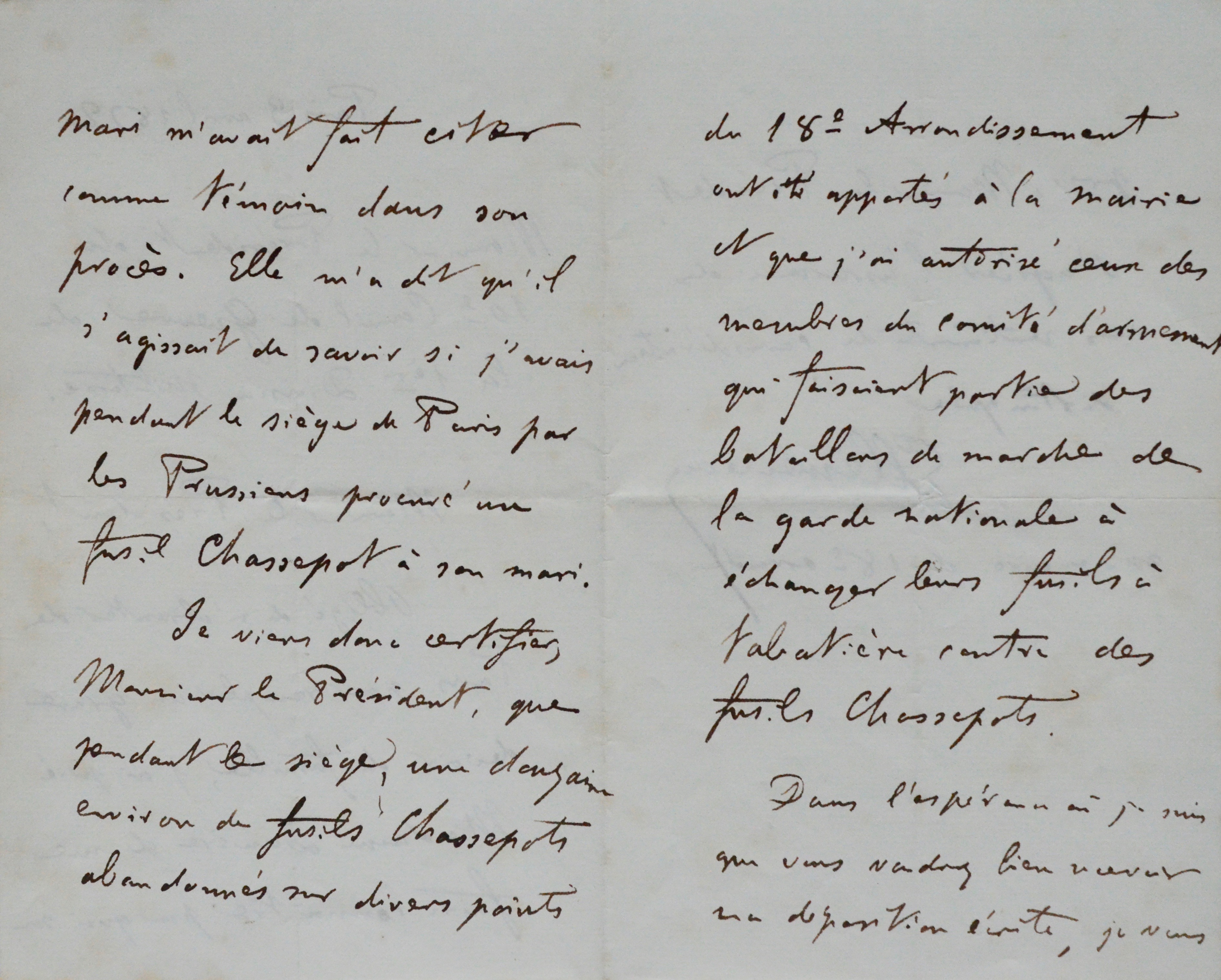 "Obligé de m'absenter de Paris pour remplir un grand devoir de famille, j'ai prié Madame Danière de me faire connaître pourquoi son mari m'avait fait citer comme témoin dans son procès. Elle m'a dit qu'il s'agissait de savoir si j'avais pendant le siège de Paris par les prussiens procuré un fusil chassepot à son mari. Je viens donc certifier, Monsieur le Président, que pendant le siège, une douzaine environ de fusils chassepot abandonnés sur divers points du 18e arrondissement ont été apportés à la Mairie et que j'ai autorisé ceux des membres du comité d'armement qui faisaient partie des bataillons de marche de la garde nationale à échanger leurs fusils à tabatière contre des fusils chassepot [...]".