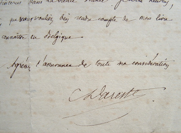Cléophas Dareste de La Chavanne (Paris, 1820/1882)Cléophas Dareste accepte l'offre de son correspondant : «de rendre compte de mon Histoire de France dans un journal de Bruxelles». Il a écrit à Plon, son éditeur, pour lui en expédier un exemplaire. «Si j'ai l'honneur d'être connu de vous, j'ai aussi celui de vous connaître. Je sais que vous avez eu des relations avec Lyon et j'ai parmi mes livres une traduction de vous d'un ouvrage curieux du XVIIe siècle intitulé Voyage de Jodocus Sincerus dans la vieille France [...]». [Le destinataire est probablement Prosper Guerrier de Dumast, qui avait publié Coup d'oeil sur l'état de la Lorraine, au commencement du XVIIe siècle, d'après l'itinéraire de Jodocus Sincérus].