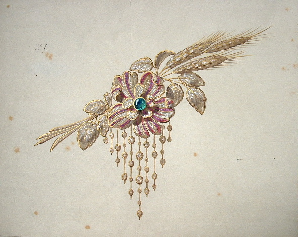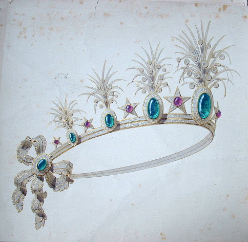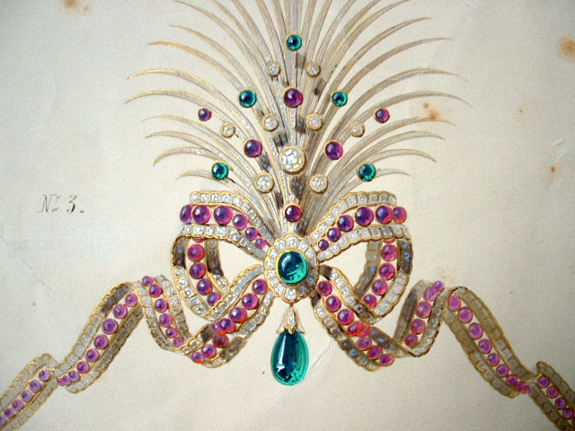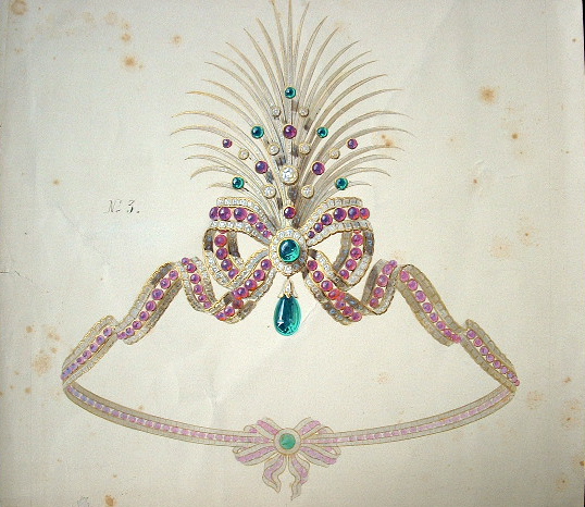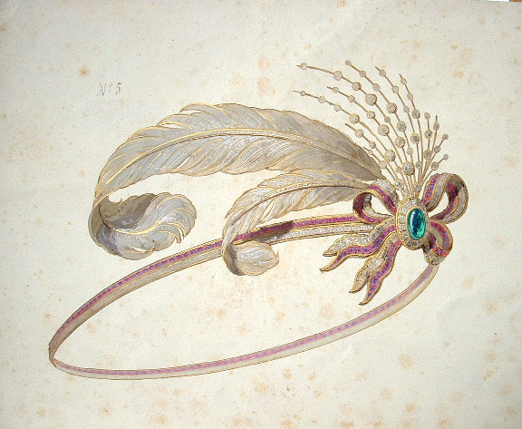5 dessins, à la gouache, représentant des diadèmes et autres coiffes de pierres précieuses. Détails de grande finesse. Numérotées de 1 à 5.