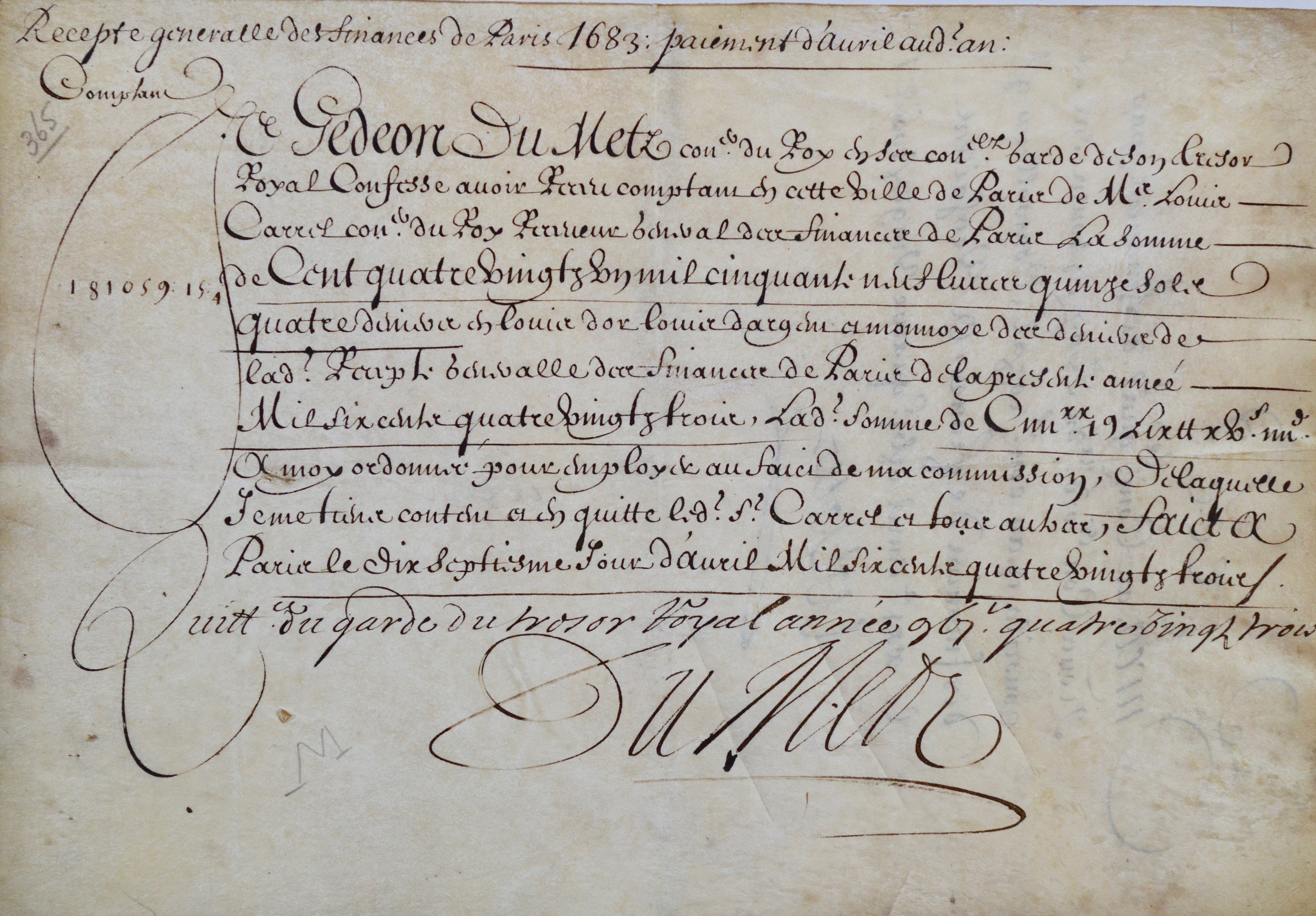 Quittance de la commission reçue par le garde du trésor royal, Gédéon Du Mets, pour la somme de 181.059 livres, 15 sols et 4 deniers "en louis d'or louis d'argent et monnoyes des deniers de ladite recette generalle des finances de Paris". Gédéon Du Mets ajoute une ligne de sa main et signe le document. Pour cette somme très importante, Colbert donne son accord et signe, au dos, sous cette mention : "Enregistré au contrôle général des finances par nous conseiller ordinaire du Roy en tous ses conseils et au conseil royal, contrôleur général des finances de France à Versailles". [Gédéon Berbier du Mets (1626/1709), président de la Chambre des comptes, fut également le premier intendant-contrôleur général du Garde-meuble de la Couronne].