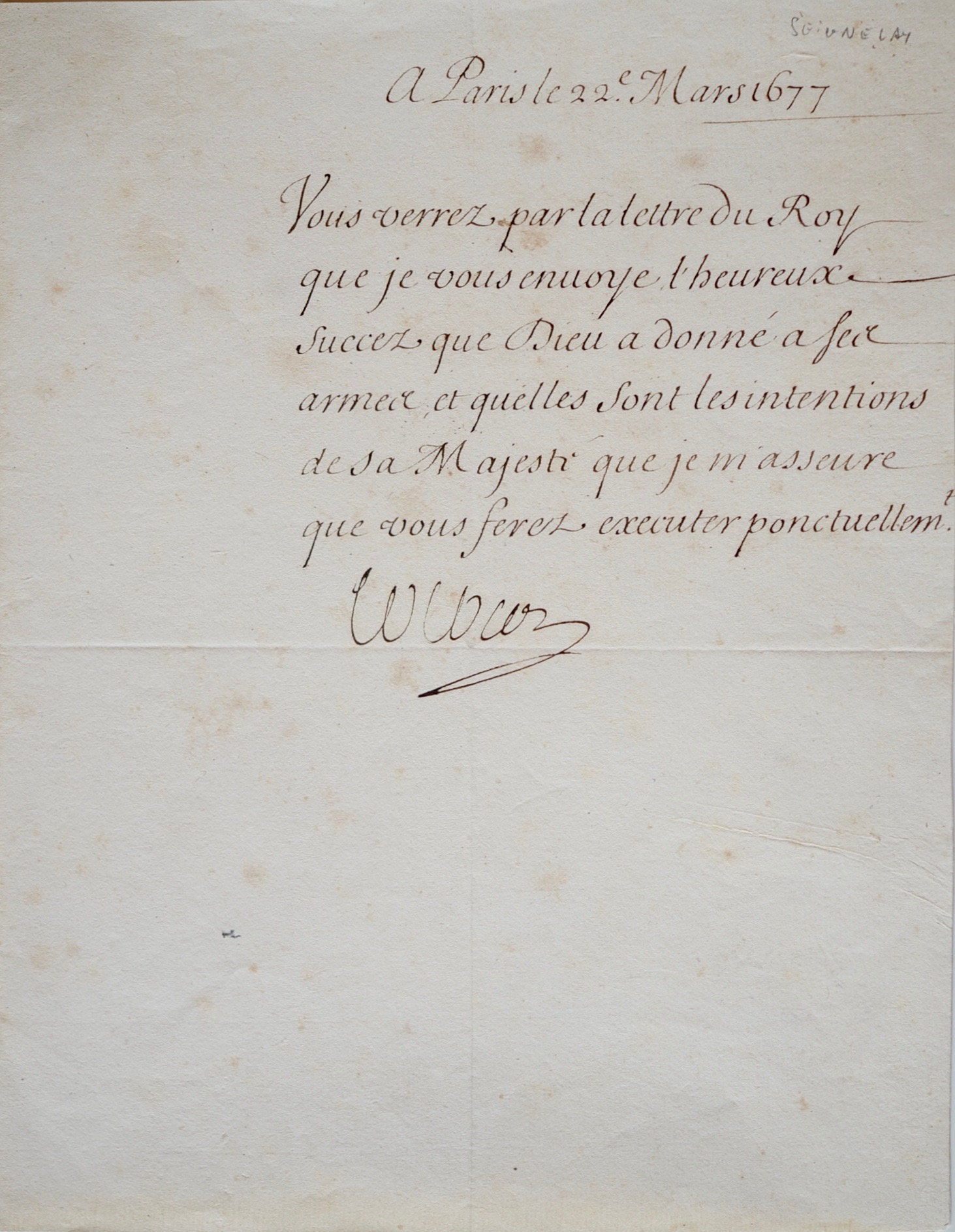 Colbert annonce la victoire des troupes du Roi et fera suivre ses ordres. Il s'agit de la prise de Valenciennes :