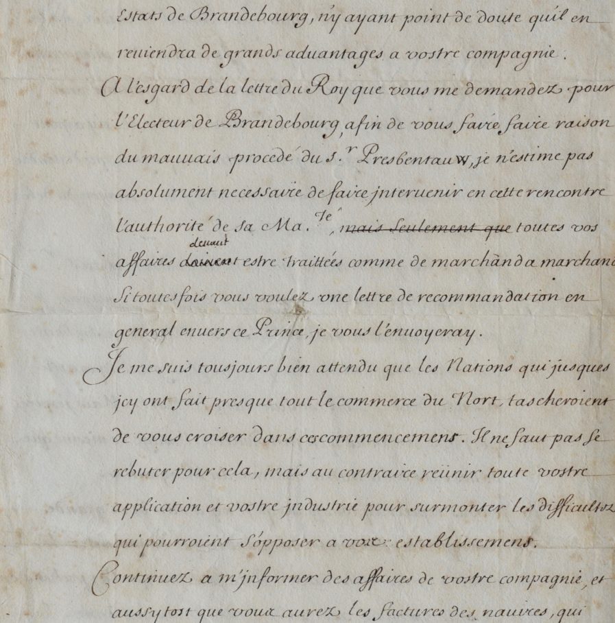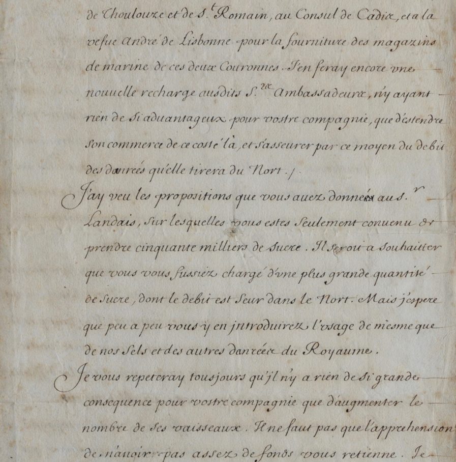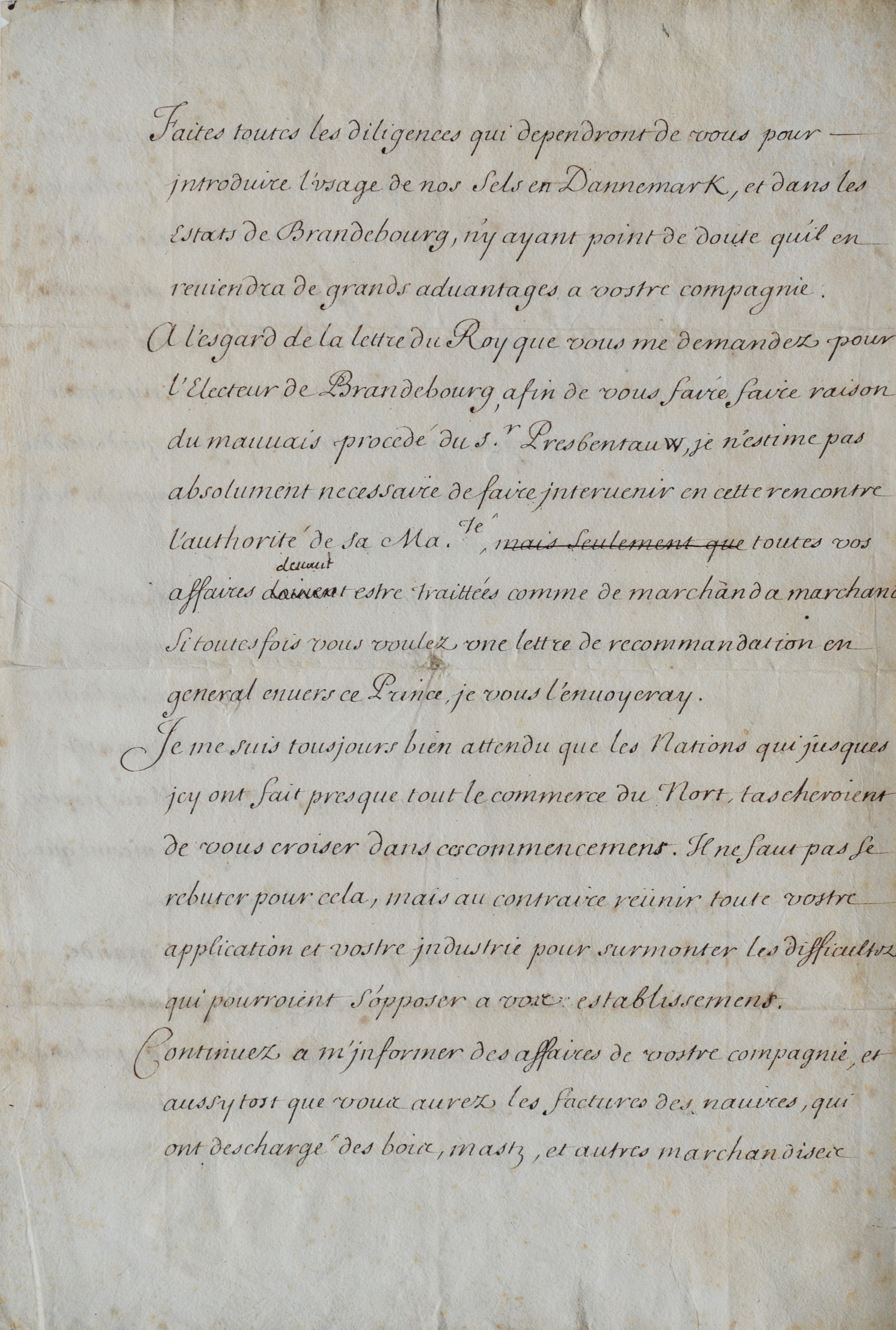 Colbert nourrit de grandes ambitions quant au développement de cette nouvelle compagnie et encourage fortement toutes les exportations. Il se réjouit de leurs contacts avec l'archevêque de Toulouse et de Saint-Romain, le consul de Cadix et André de Lisbonne, « pour la fourniture des magazins de marine de ces deux Couronnes ». Il fera donc pression sur les ambassadeurs du Portugal et d'Espagne, « n'y ayant rien de si avantageux pour vostre compagnie, que d'estendre son commerce de ce costé là, et s'asseurer par ce moyen du débit des denrées qu'elle tirera du Nort ». Il les encourage fortement à faire commerce de la plus grande quantité possible de sucre, « dont le débit est seul dans le Nort. Mais j'espère que peu à peu vous y introduirez l'usage de mesme que de nos sels et des autres denrées du Royaume. Je vous respeteray toujours qu'il n'y a rien de si grande conséquence pour vostre compagnie que d'augmenter le nombre de ses vaisseaux. Il ne faut pas que l'apprehension de n'avoir pas assez de fonds vous retienne. Je prendray soin que vous n'en manquiez pas ». Il les presse « d'introduire l'usage de nos sels en Dannemark, et dans les états de Brandebourg, n'ayant point de doute qu'il en reviendra de grands avantages à vostre compagnie », mais ne juge pas nécessaire une lettre de recommandation de la part du roi pour l'électeur de Brandebourg : « toutes vos affaires devraient estre traitées comme de marchand à marchand. [...] Continuez à m'informer des affaires de vostre compagnie, et aussytost que vous aurez les factures des navires, qui ont déchargé des bois, massez, et autres marchandises dans les arsenaux de Rochefort et Brest, ne manquez pas de m'en envoyer les copies".