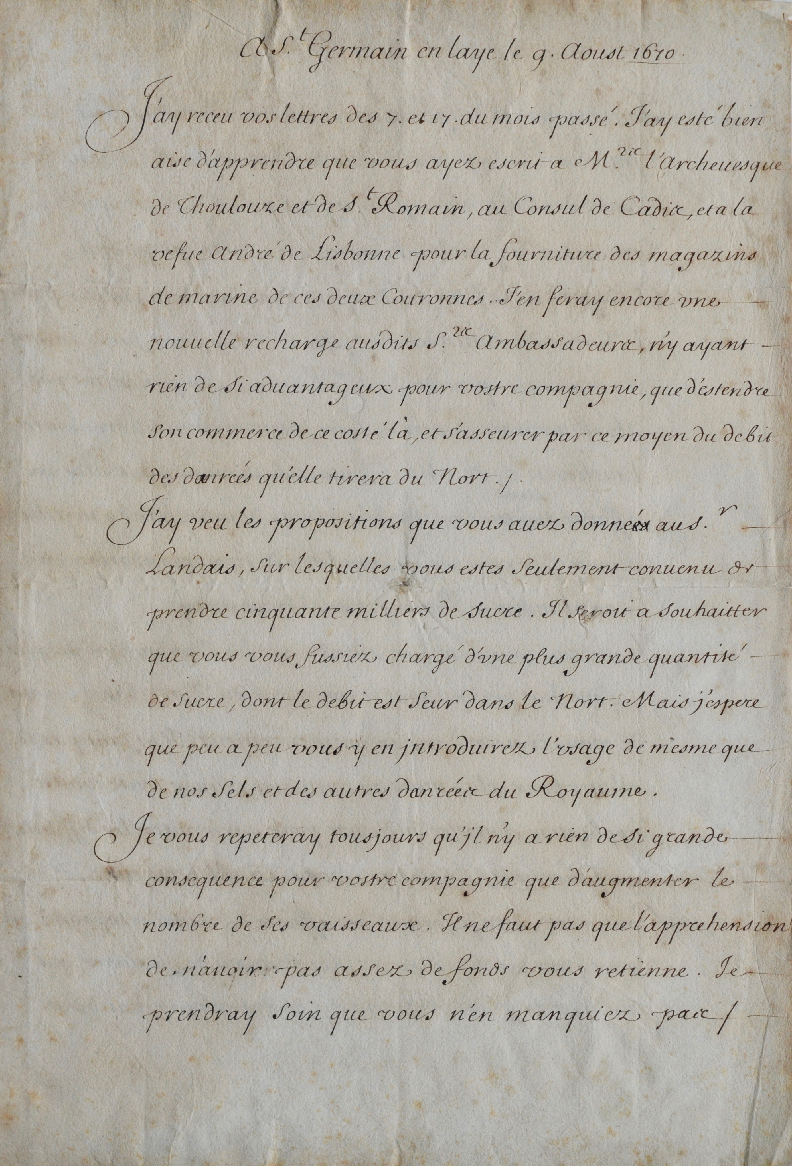 17 lettres de Colbert aux directeurs de la Compagnie du Nord sont connues et ont été publiées en 1852 dans la Correspondance administrative sous le règne de Louis XIV, datée entre le 19 décembre 1670 et le 30 juillet 1672. Celle-ci semble être la toute première et inédite.
