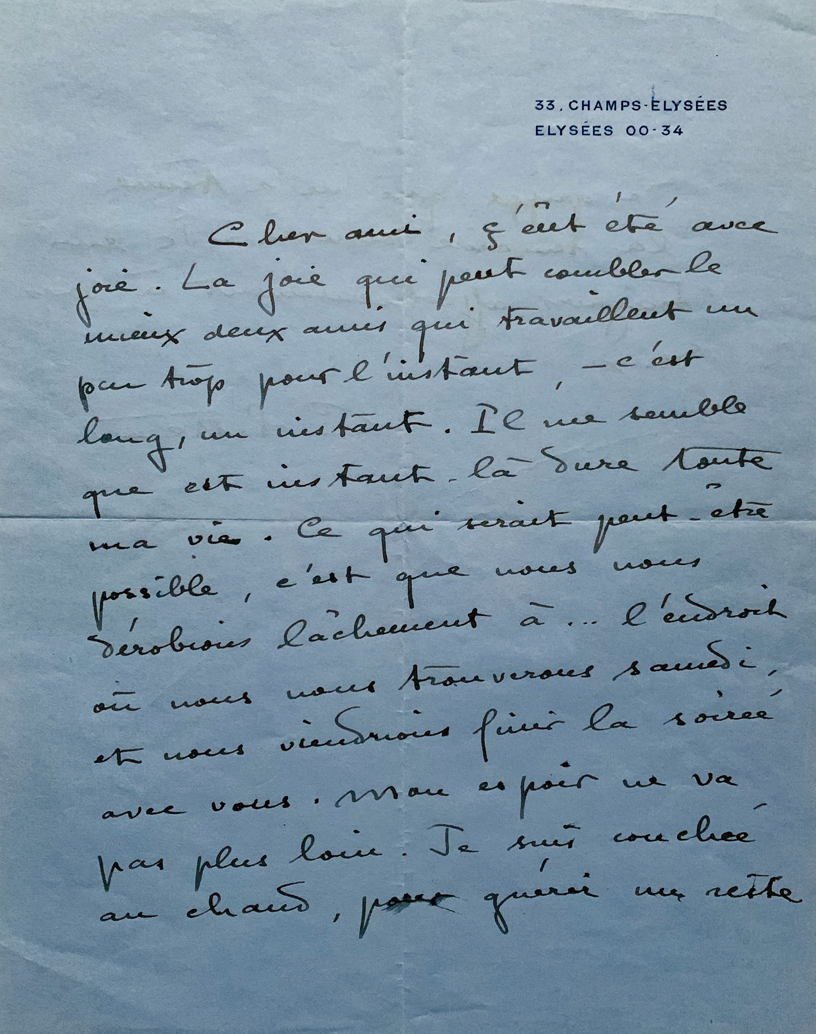 "Cher ami, ç'eut été avec joie. La joie qui peut combler le mieux deux amis qui travaillent un peu trop pour l'instant, -c'est long, un instant. Il me semble que cet instant-là dure toute ma vie. Ce qui serait peut-être possible, c'est que nous nous dérobions lâchement à... l'endroit où nus nous trouverons samedi, et nous viendrions finir la soirée avec vous. Mon espoir ne va pas plus loin. Je suis couchée au chaud [...]".