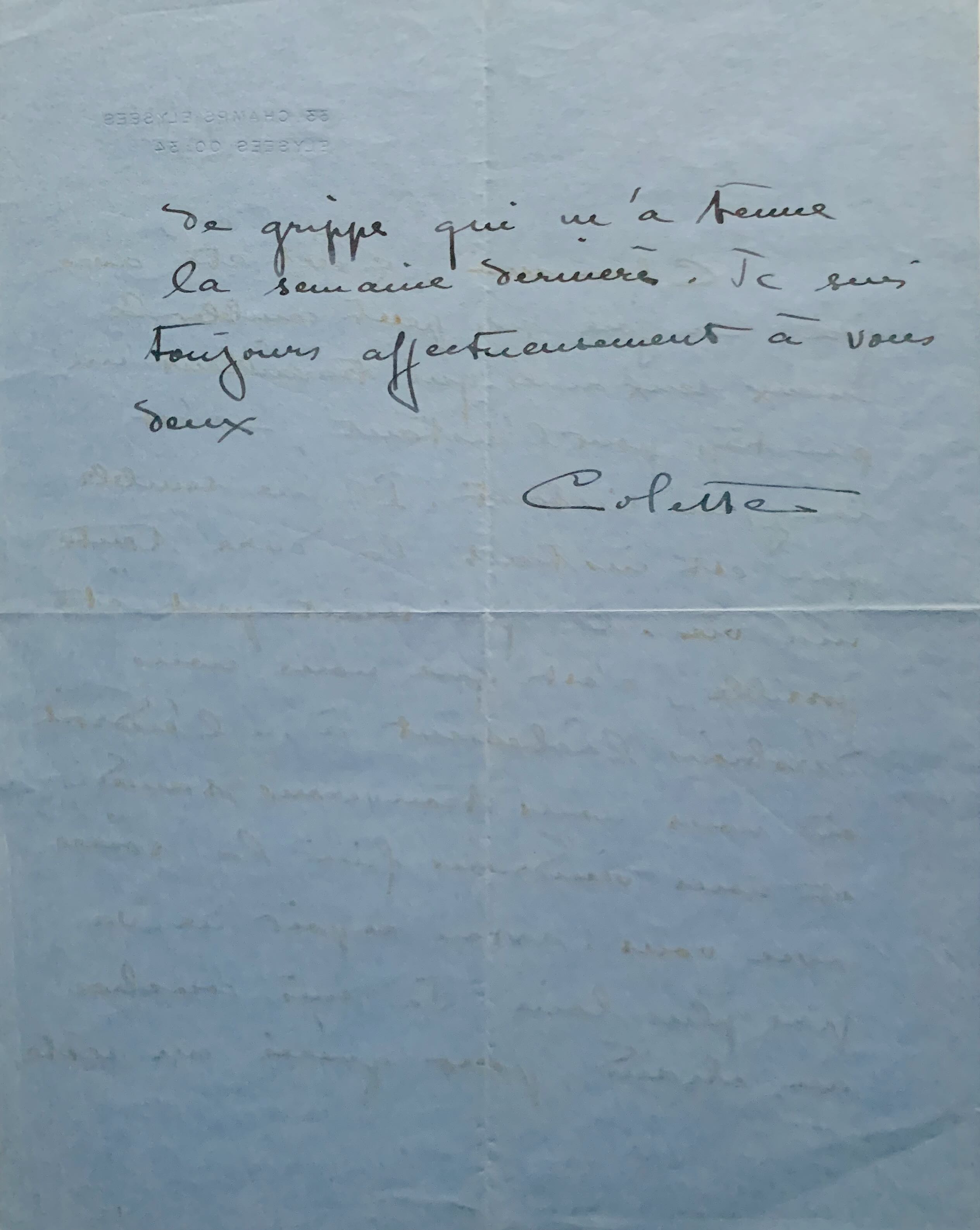 Papier bleu avec en-tête à son adresse "33, Champs-Élysées". Enveloppe jointe (mouillure sur un côté).