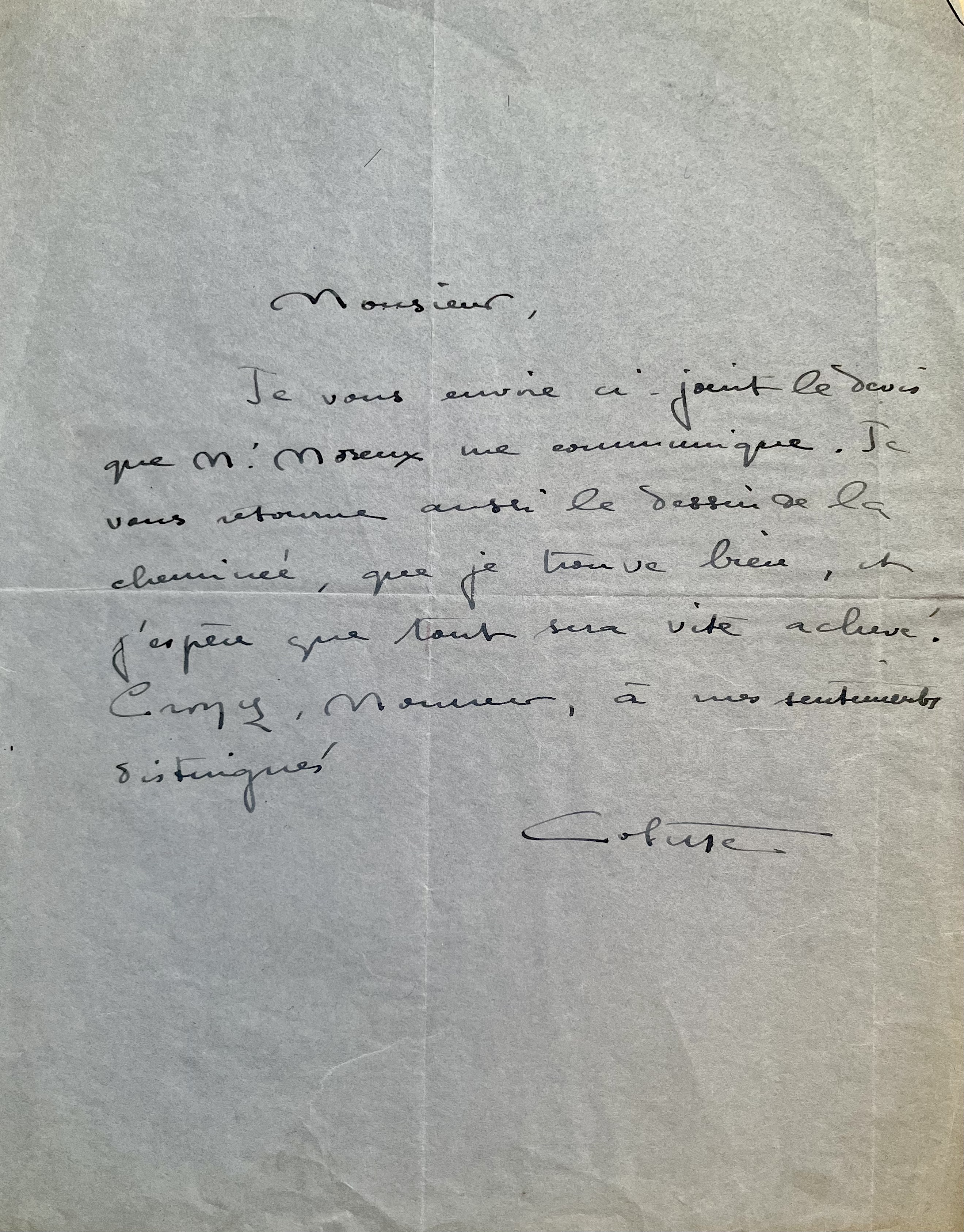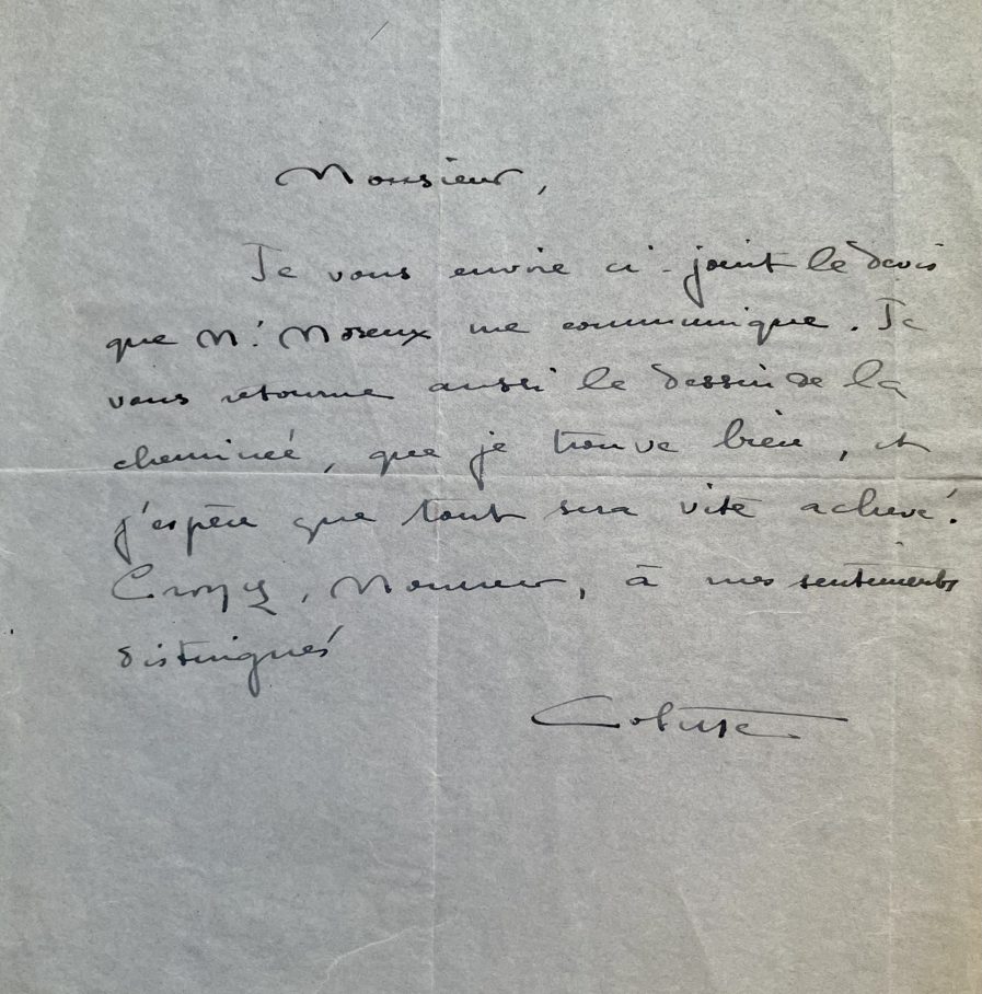 Colette choisit une nouvelle cheminée, élément cher à son intérieur : "Je vous envoie ci-joint le devis que M. Moreux me communique. Je vous retourne aussi le dessin de la cheminée, que je trouve bien, et j'espère que tout sera vite achevé [...]".