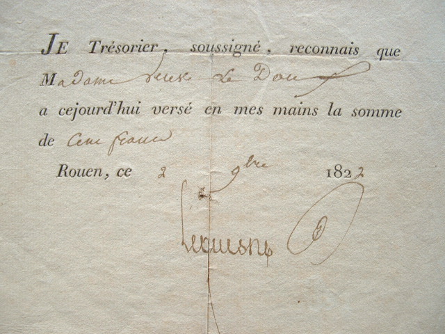 Pièce pré-imprimée : «Collecte pour les réparations de l'Eglise Cathédrale et Métropolitaine de Rouen, en conséquence du mandement de monseigneur François de Pierre de Bernis [...]». Complétée et signée par le trésorier Lequesne, qui reconnaît avoir reçu de Mme veuve Le Doux la somme de cent francs. [La cathédrale de Rouen venait d'être ravagée par un incendie].