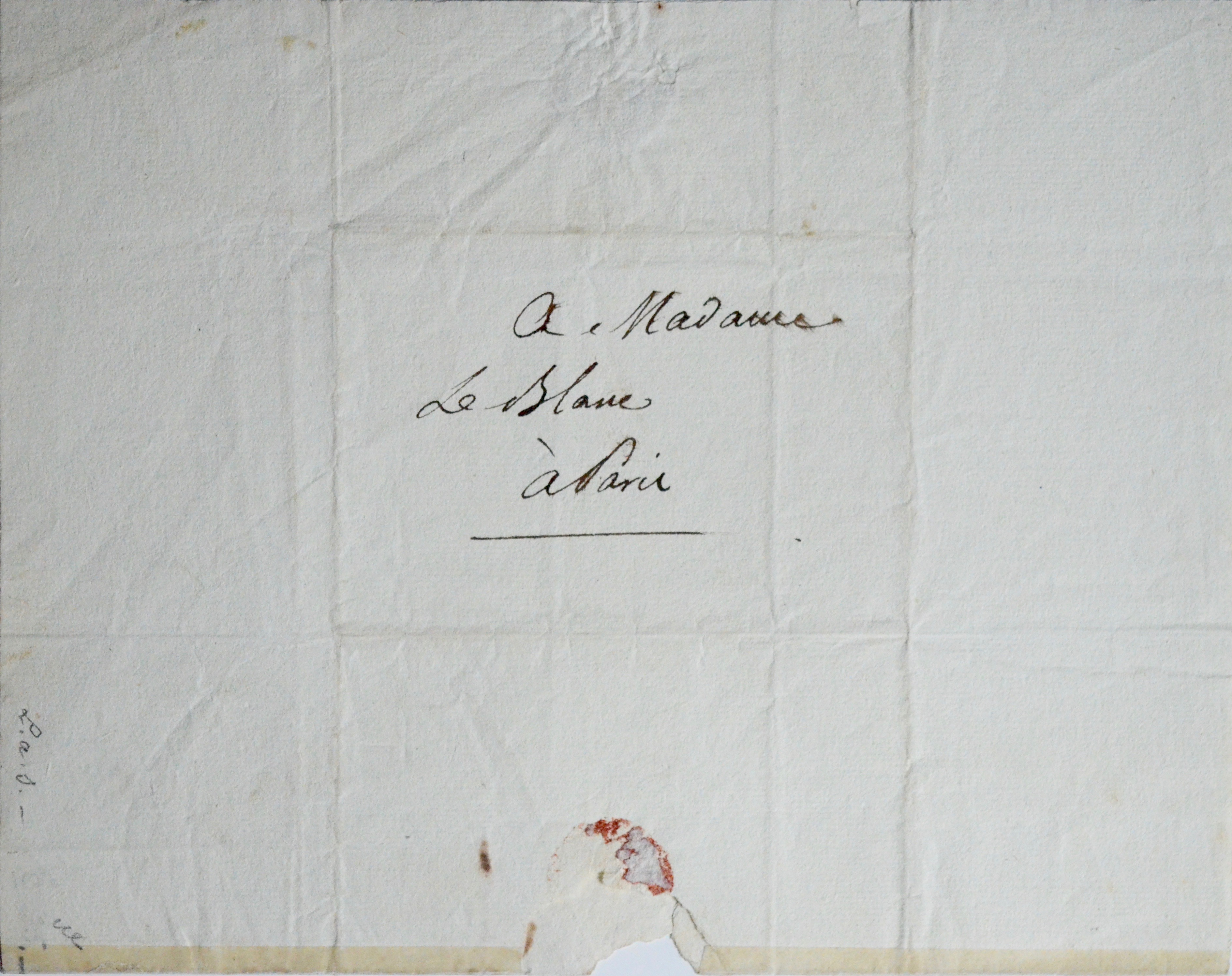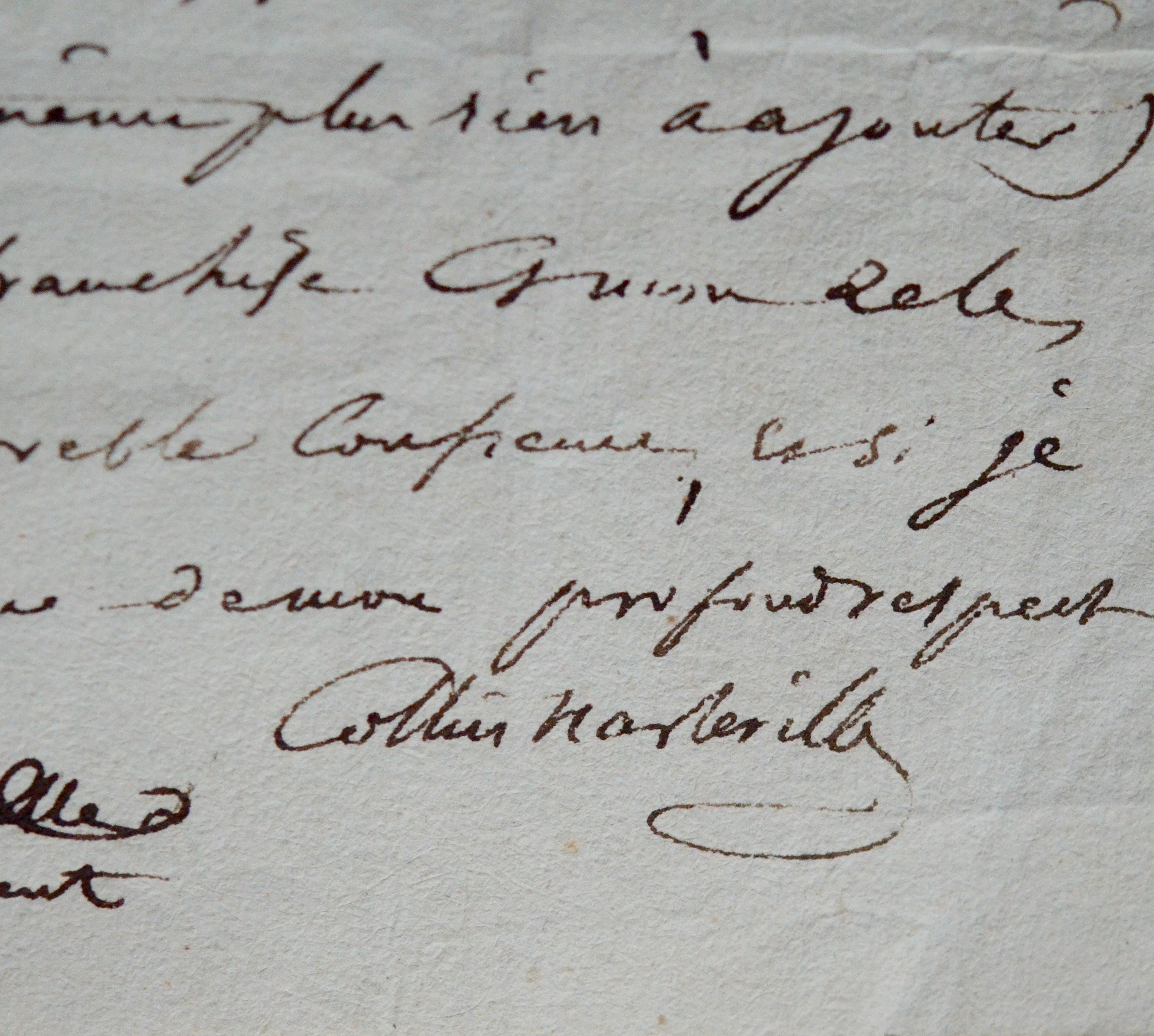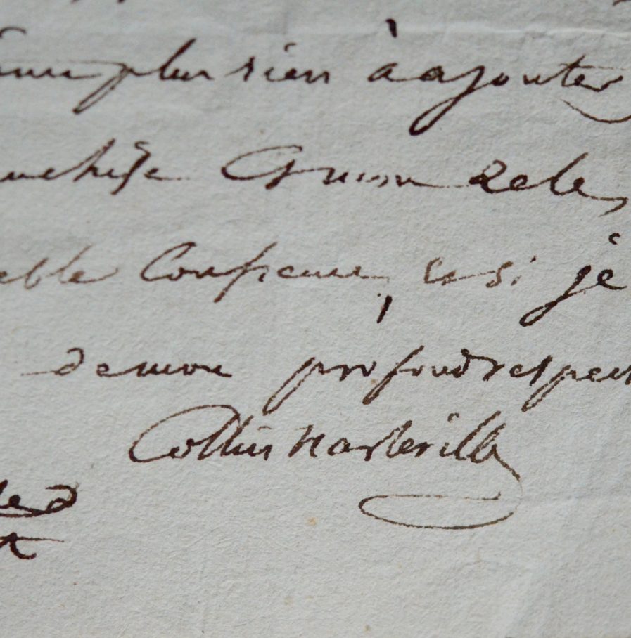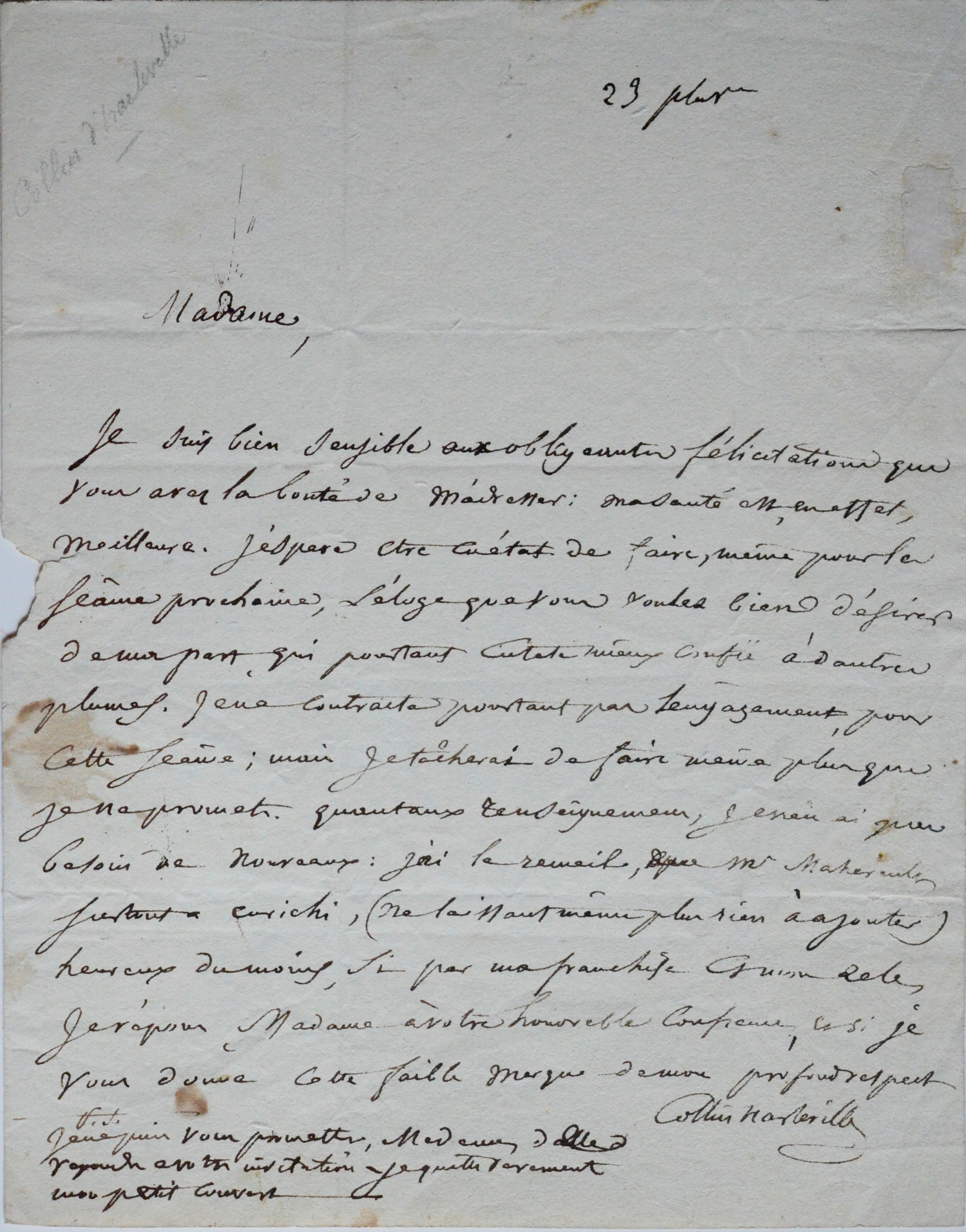 Jean François Collin d'Harleville (Mévoisins, 1755/1806)Jean-François Collin d’Harleville va mieux et explique à la veuve d'Antoine Leblanc : "J'espère être en état de faire, même pour la séance prochaine, l'éloge que vous voulez bien désirer de ma part qui pourtant eut été mieux confié à d'autres plumes. Je ne contracte pourtant pas l'engagement, pour cette séance ; mais je tâcherai de faire même plus que je ne promets. Quant aux renseignements, je n'en ai pas besoin de nouveaux : j'ai le recueil que Mr. Maherault (?) surtout a enrichi, (ne laissant même plus rien à ajouter) [...]".