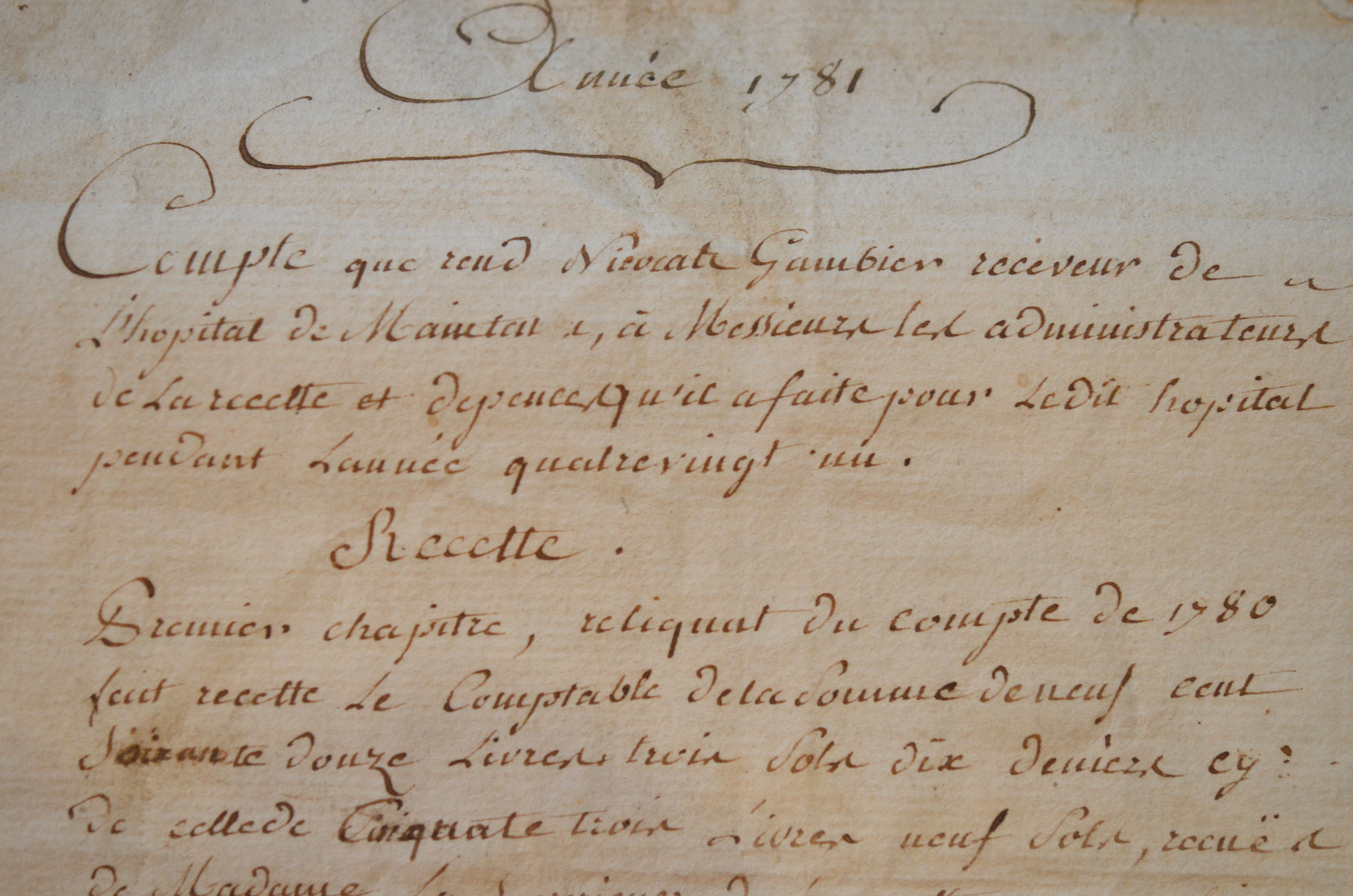 « Année 1781. Compte que rend Nicolas Gambier, receveur de l'hôpital de Maintenon, à messieurs les administrateurs de la recette et dépense qu'il a faite pour ledit hôpital pendant l'année quatre vingt un ». Le document est signé par 6 administrateurs de l'hôpital.